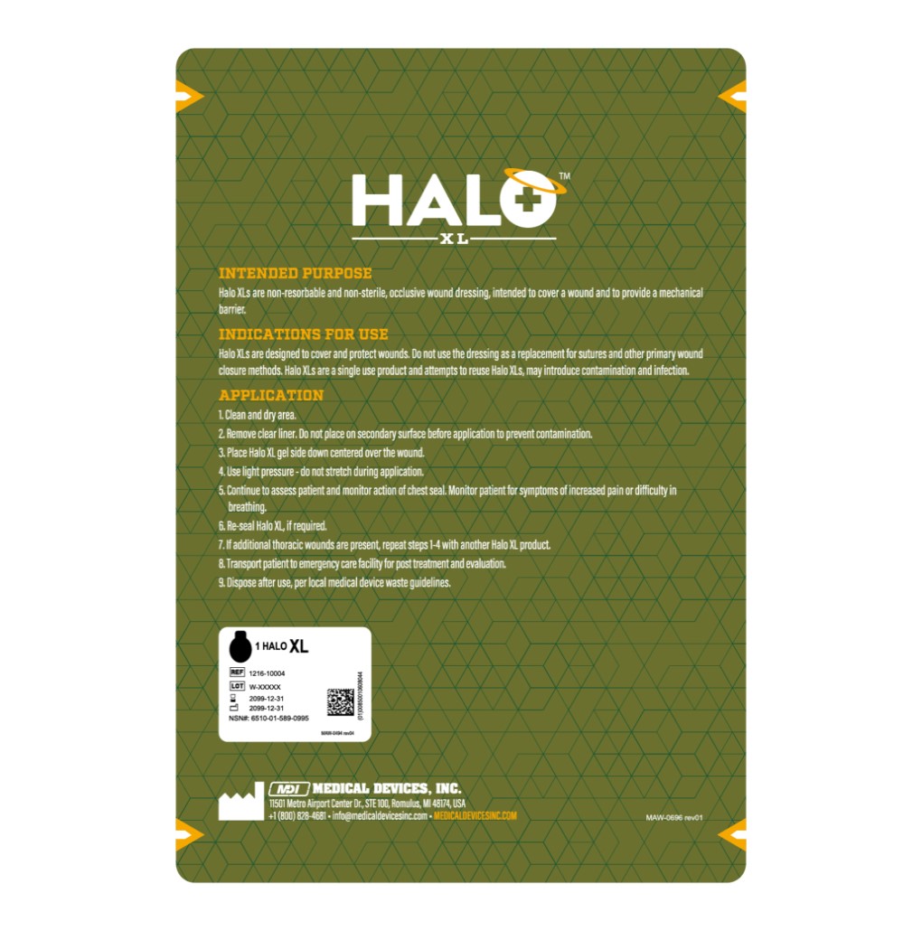 Okluzivní krytí Halo XL je zdravotnický prostředek, který se skládá z přilnavé hydrogelové vrstvy a přilnavé (nelatexové) podkladové vrstvy. Halo XL neobsahuje žádné léčivé látky a není vyroben ze zvířecích nebo lidských derivátů. Přípravky Halo XL nepropouštějí tekutiny a utěsňují ránu. Halo XL jsou určeny k použití do doby, než bude možné pacienta převézt do zdravotnického zařízení, kde budou odstraněny za účelem vyhodnocení stavu pacienta a následné péče.