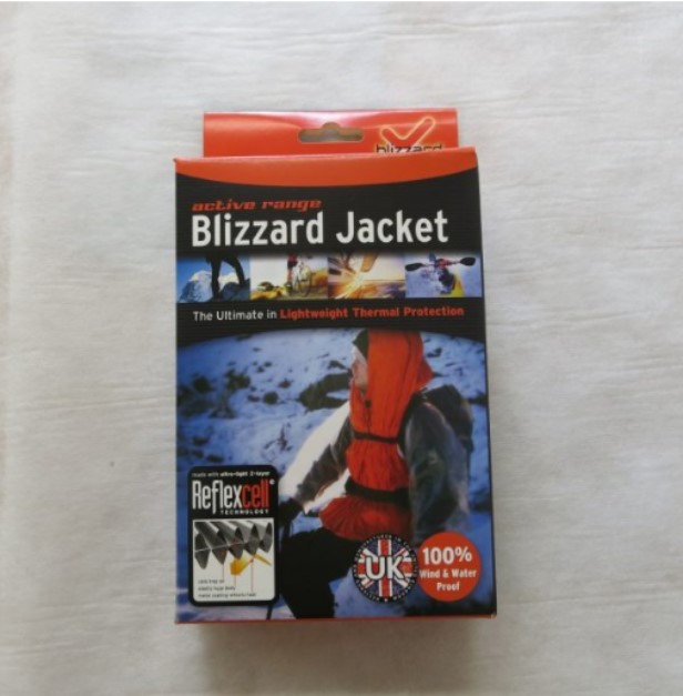 Bunda Blizzard Survival je unikátní oděv s miniaturní sbalitelnou velikostí. Bunda sahající až po stehna s kapucí, vyrobená z materiálu Reflexcell™, umožňuje nositeli být chráněn a zahřátý a zároveň zůstat plně mobilní.