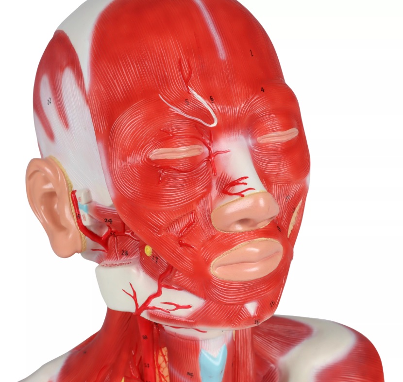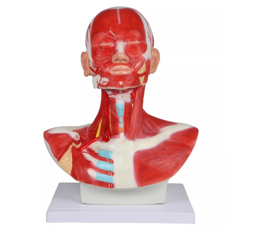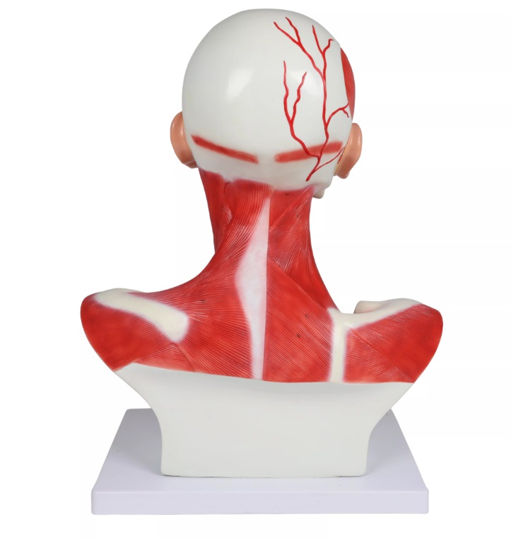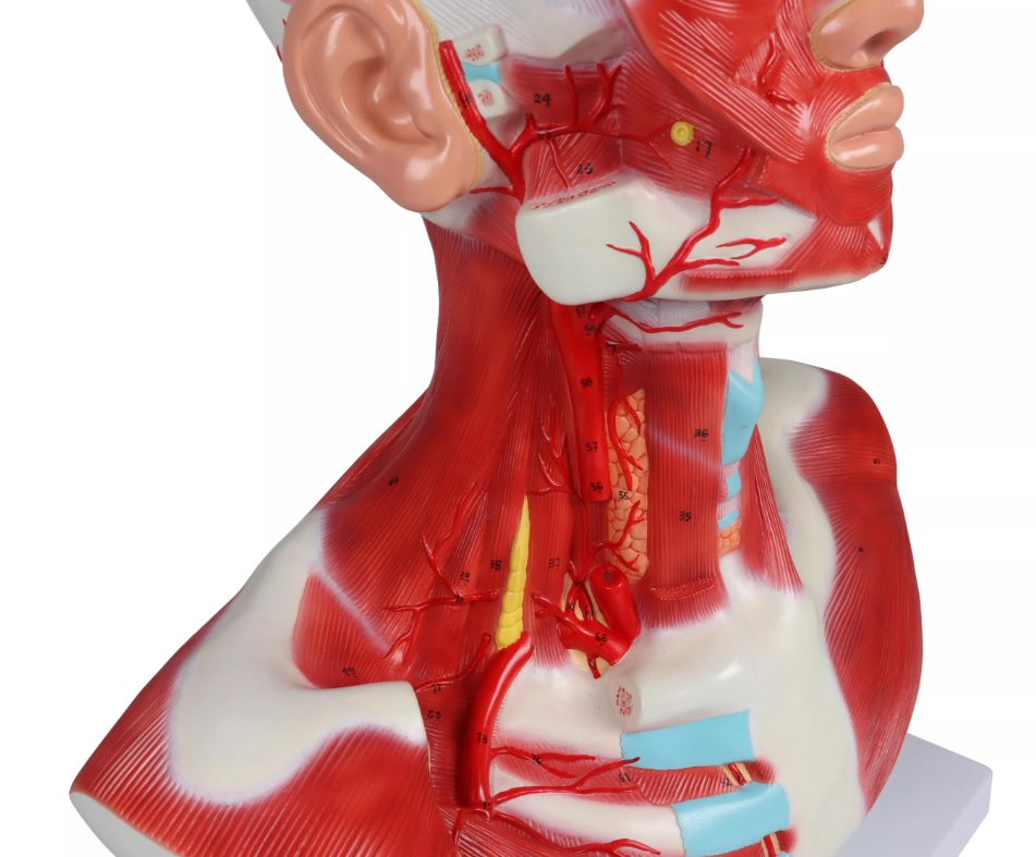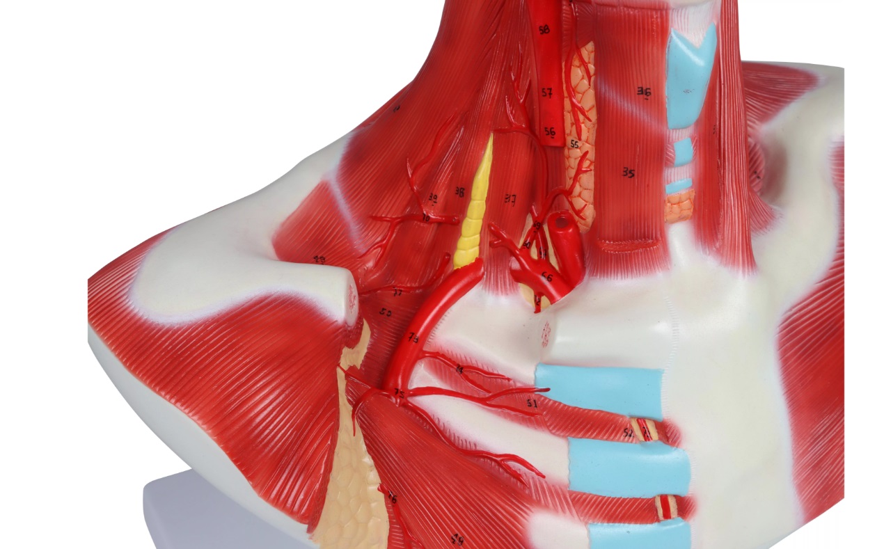 Tento jednodílný model zobrazuje svaly hlavy, krku a horní části hrudníku. Na modelu můžeme vidět nejen svaly, ale také dráhu podklíčkové a krční tepny. Model je upevněn na podstavci.