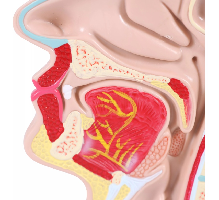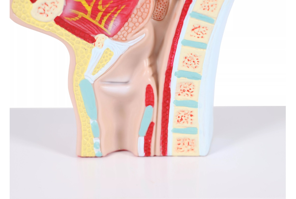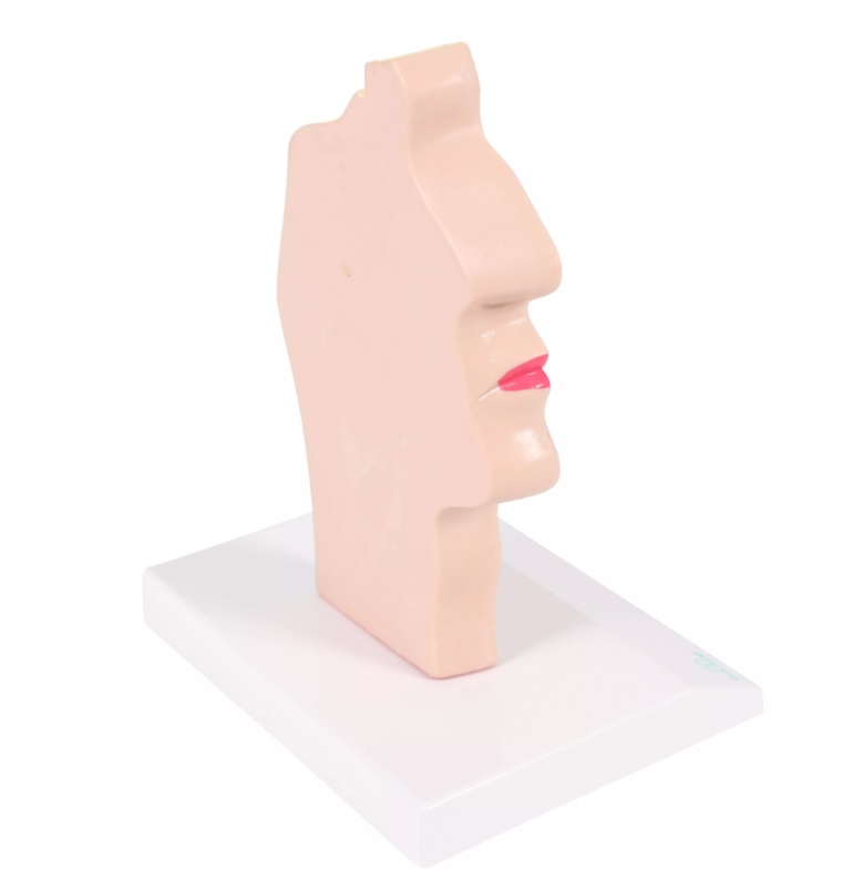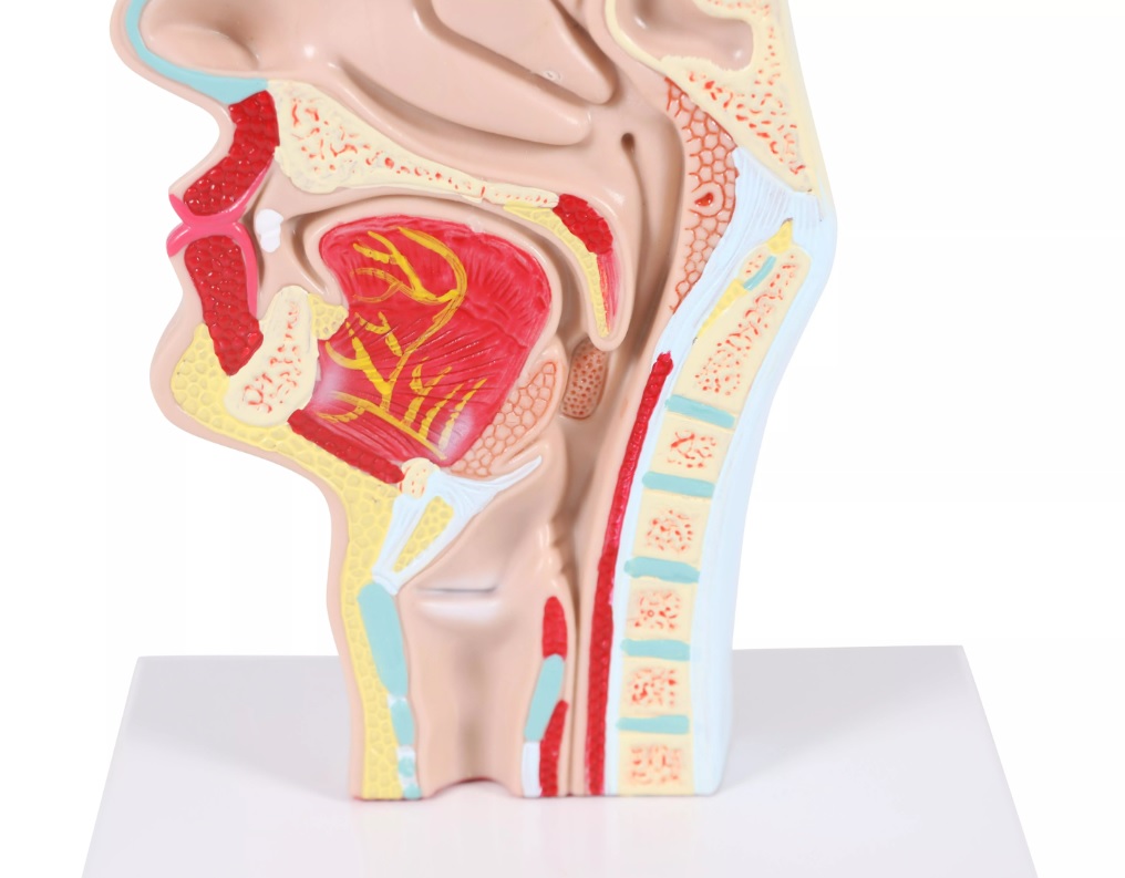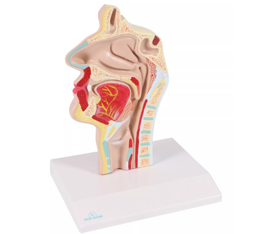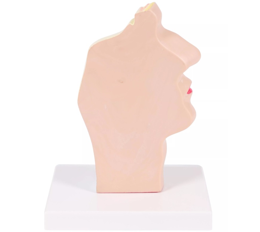 Model hlavy v průřezu zobrazuje všechny struktury, jako jsou kosti, dutiny, nosohltan, hltan, jazyk, průdušnici a část páteře. Model je upevněn na podstavci.