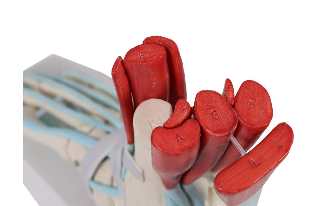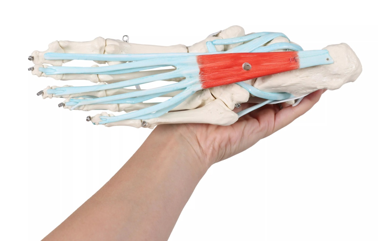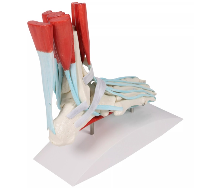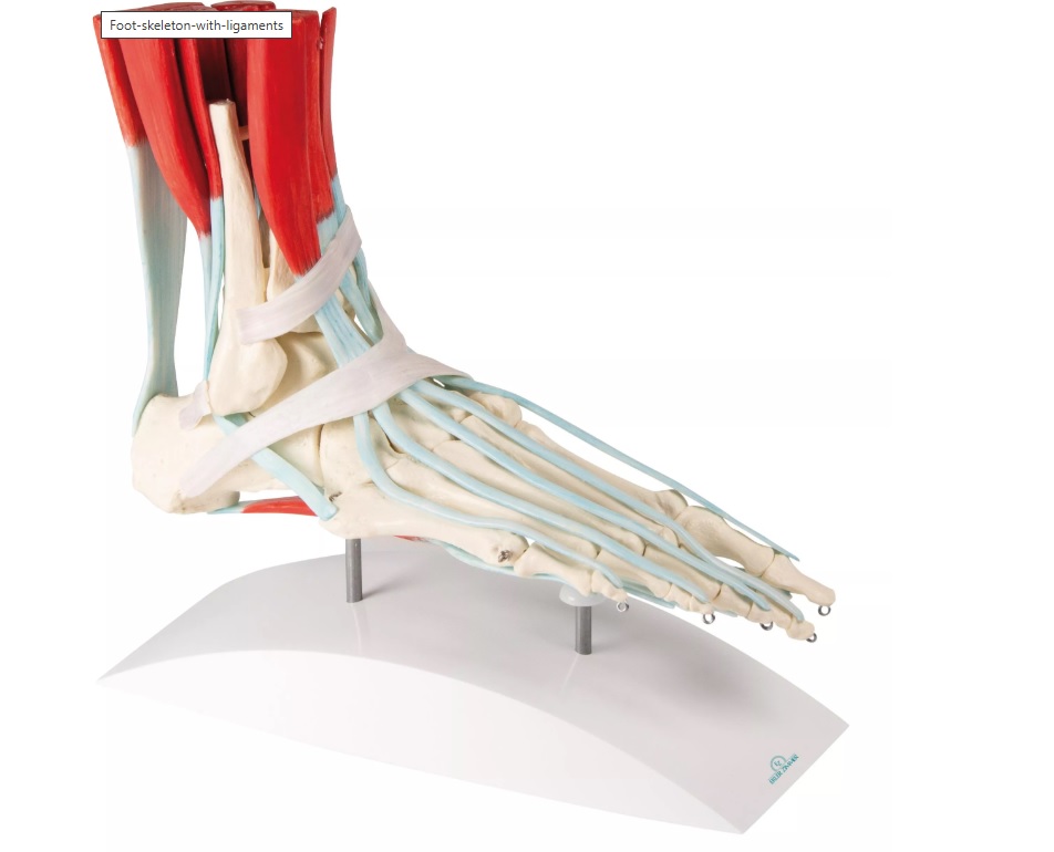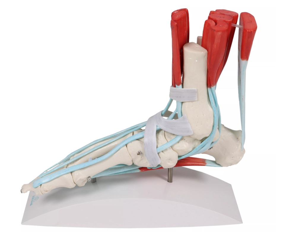 Kostra nohy v životní velikosti včetně vazů se souvisejícími svaly. Všechny kosti chodidla, stejně jako začátek holenní kosti a lýtkové kosti (fibuly) jsou zobrazeny samostatně. Zobrazeny jsou následující svaly s vazy: svaly Flexor digitorum longus,Posterior tibial (hluboký sval lýtka), Flexor hallucis longus (ohýbač), Peroneus longus, Peroneus brevis, Extensor hallucis longus (dlouhý natahovač), Extensor digitorum longus (dlouhý natahovač) Tibialis anterior (sval na přední straně bérce), Superior fibular retinaculum, dolní natahovač chodidla, sval Soleus a Flexor digitorum brevis. S odnímatelným stojanem a kartou v latině, němčině a angličtině.