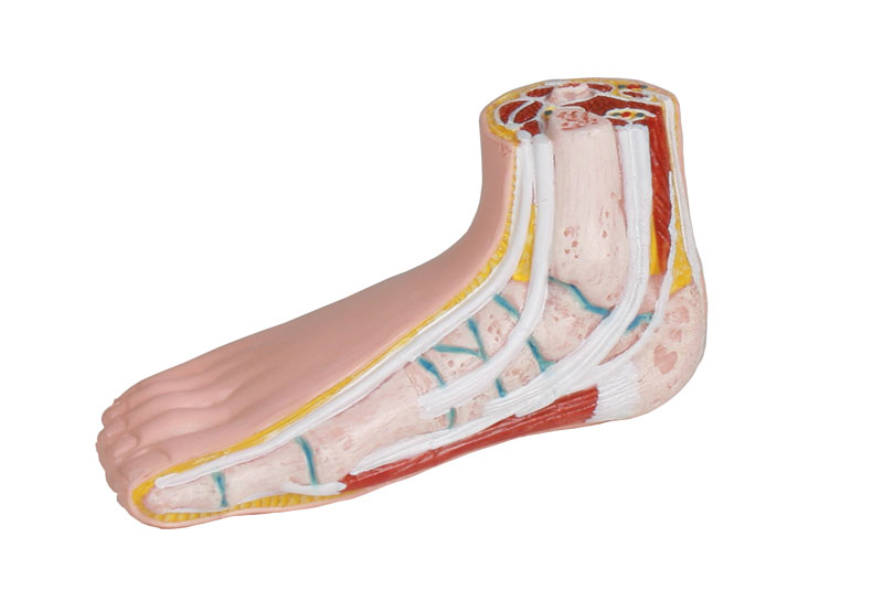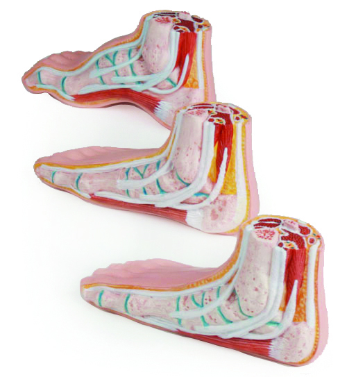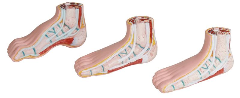 Model normální nohy, ploché nohy a klenuté nohy v přibližně poloviční velikosti. Modely jsou odkryty na boku a na začátku dolní končetiny, zobrazeny jsou kosti, svaly a vazy. Zmenšená reprodukce modelů M230, M231 a M232. K dispozici pouze jako sada.