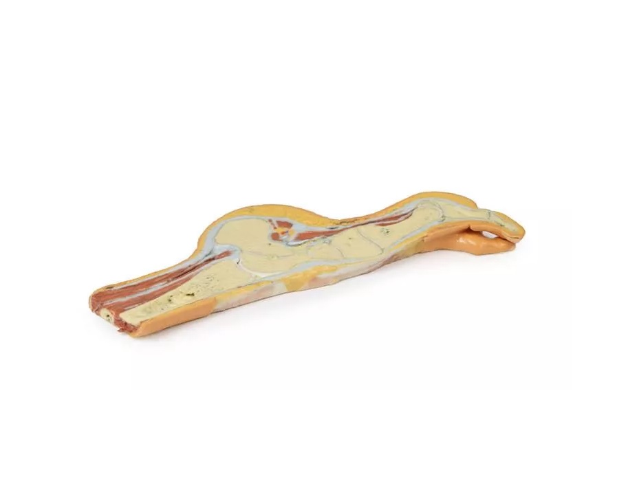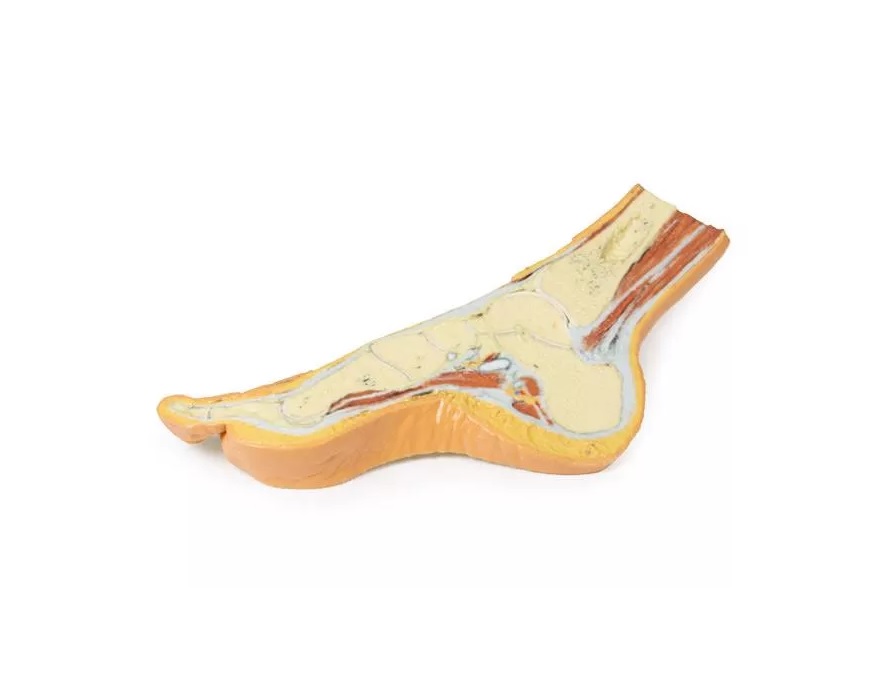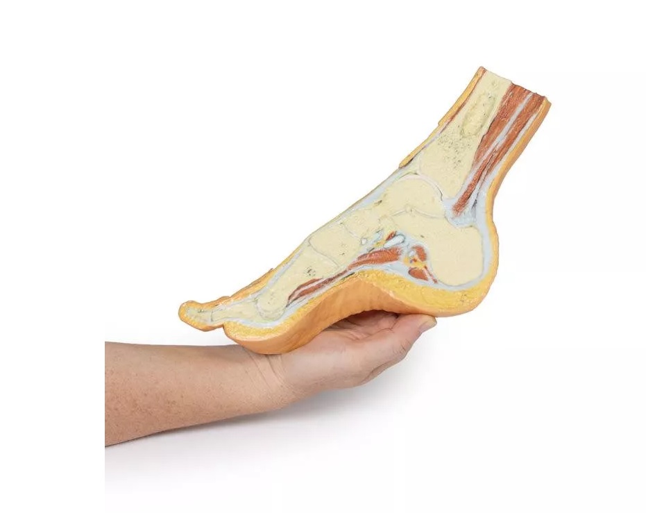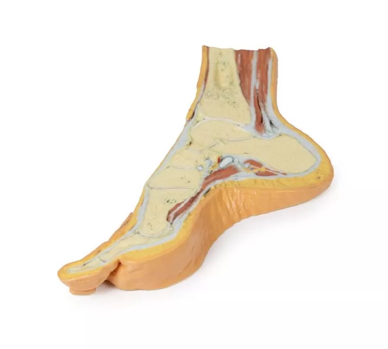 Tento 3D vytištěný model zobrazuje parasagitální průřez mediální částí pravé distální tibie a chodidla a znázorňuje kosterní struktury mediální podélné klenby chodidla a okolní struktury měkkých tkání.