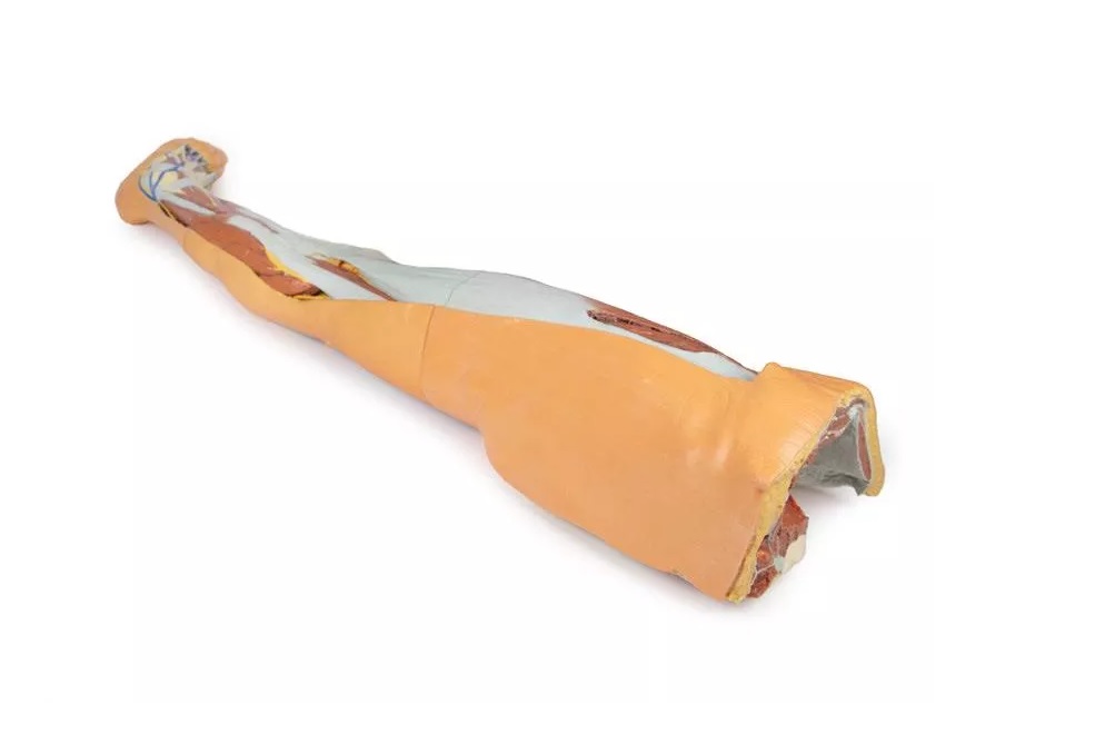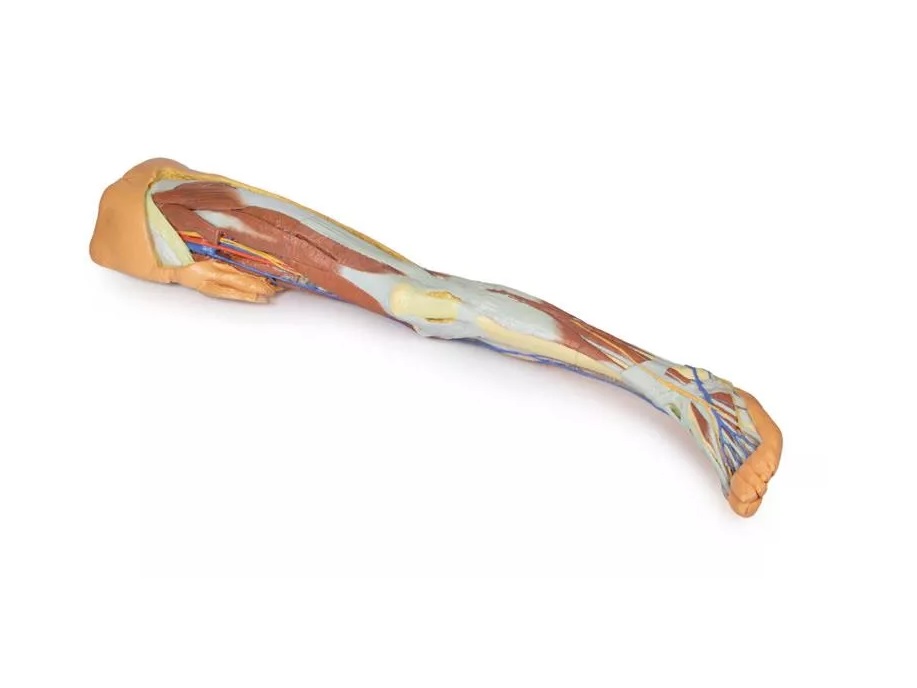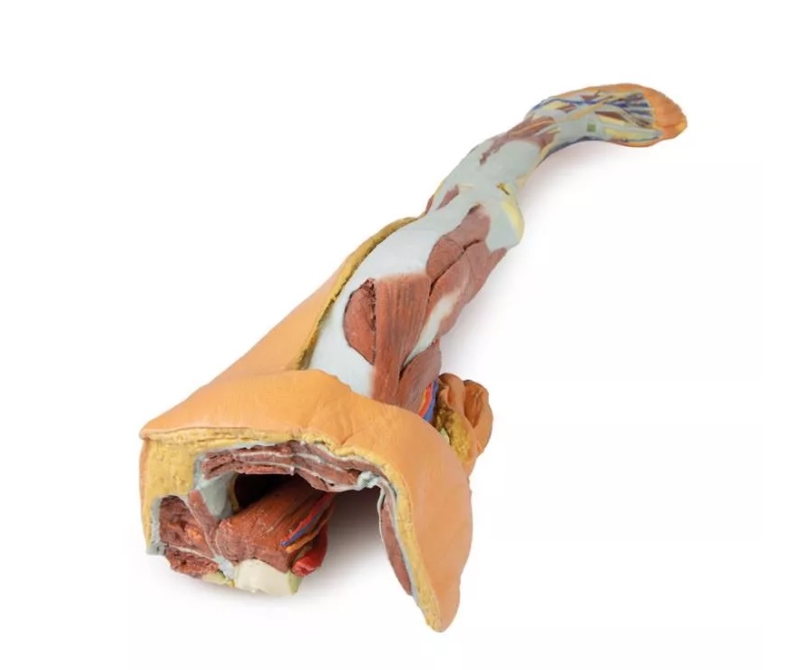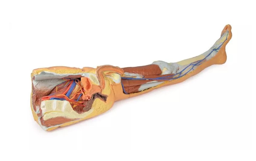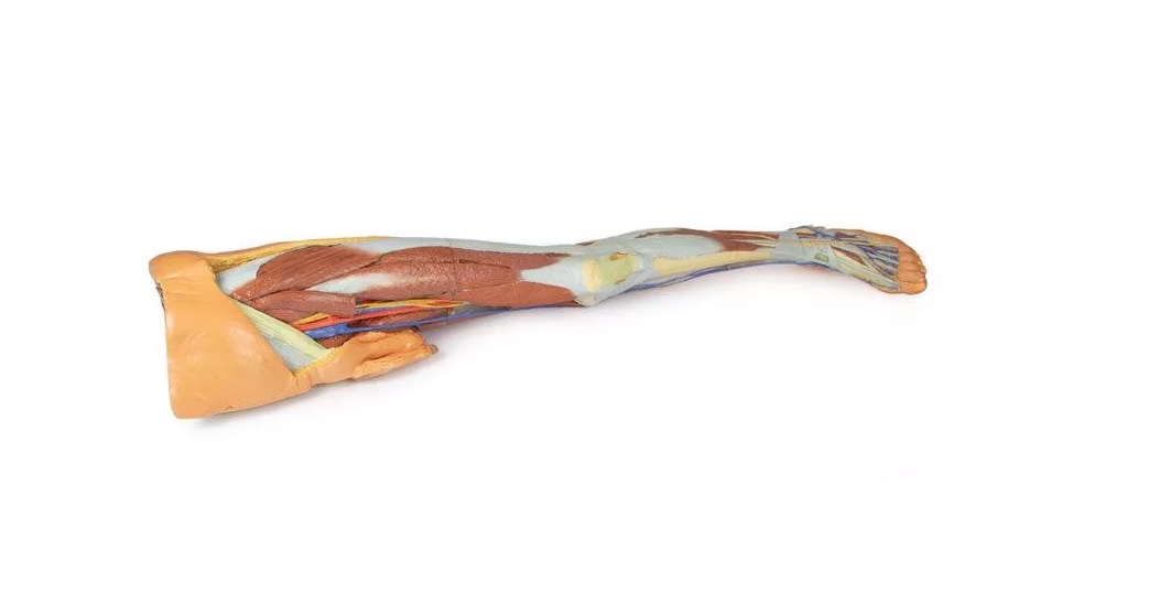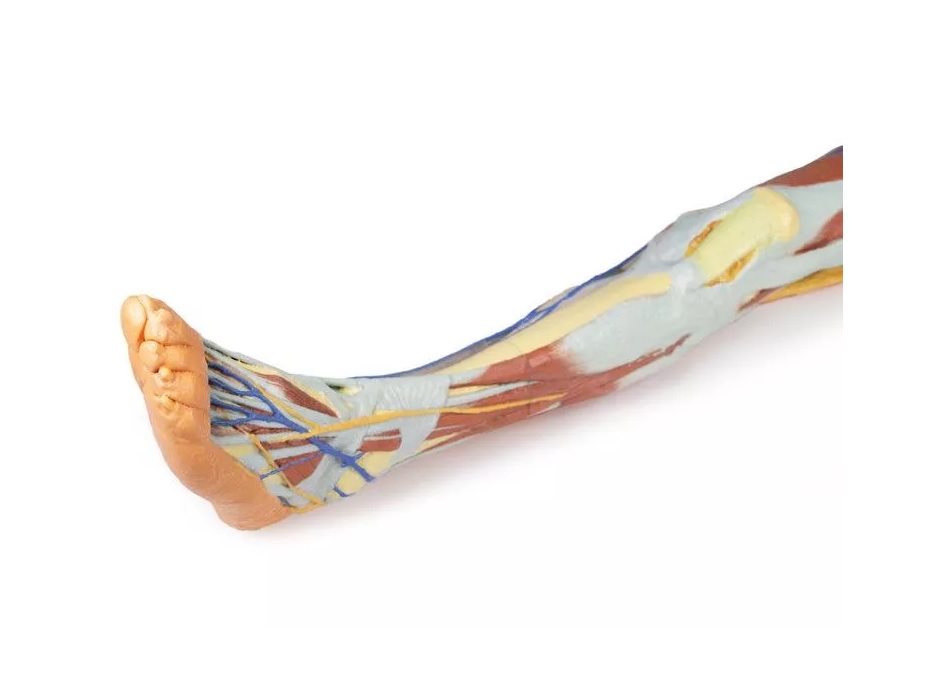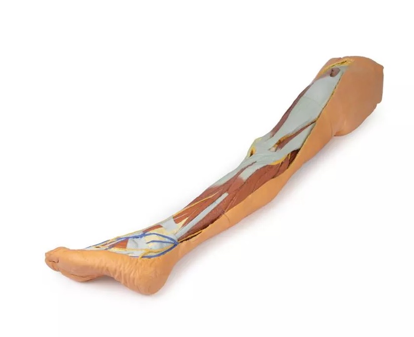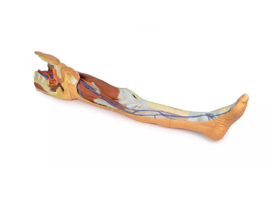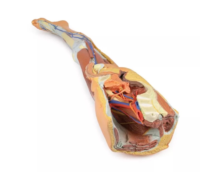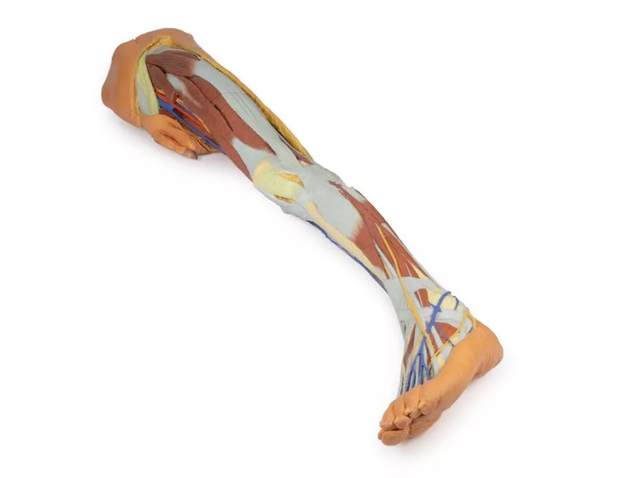 Tento 3D tištěný model kombinuje model mužské dolní končetiny s povrchovou disekci (referenční číslo MP1816) s modelem levé části mužské pánve (referenční číslo MP1765).