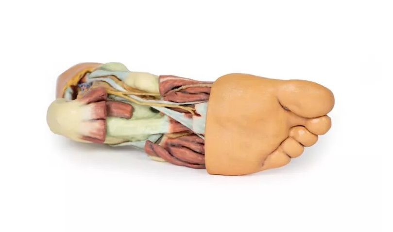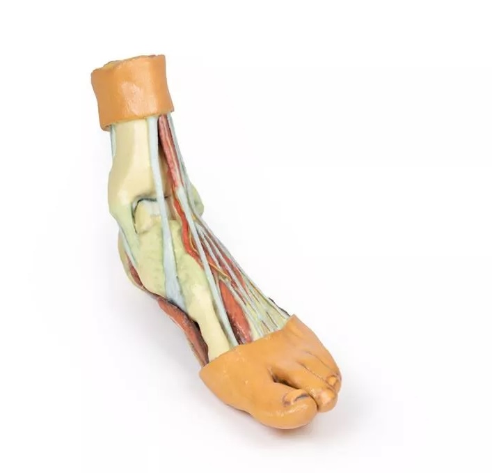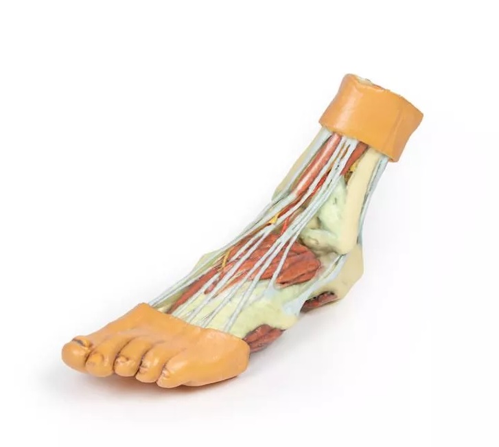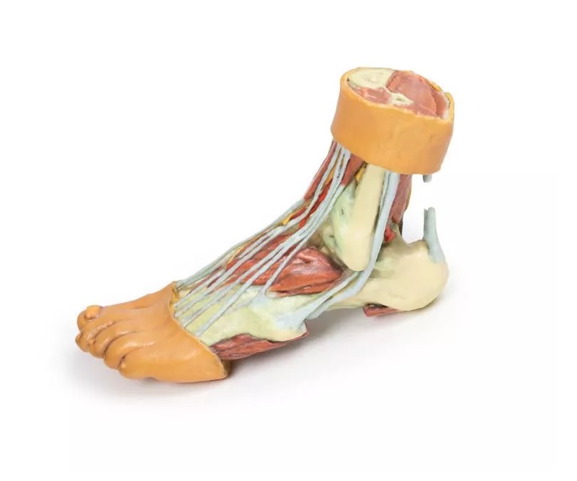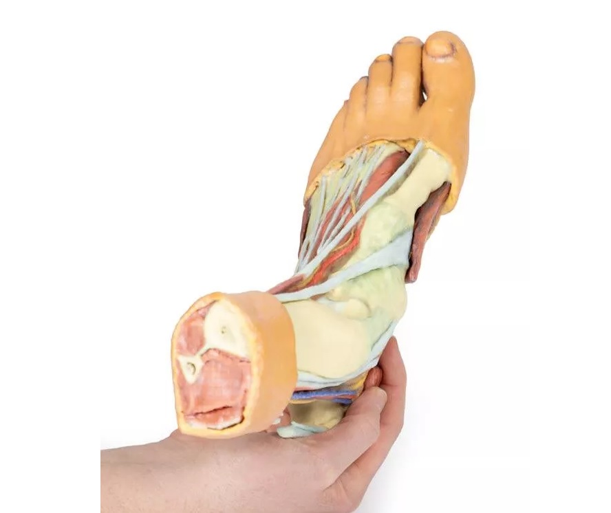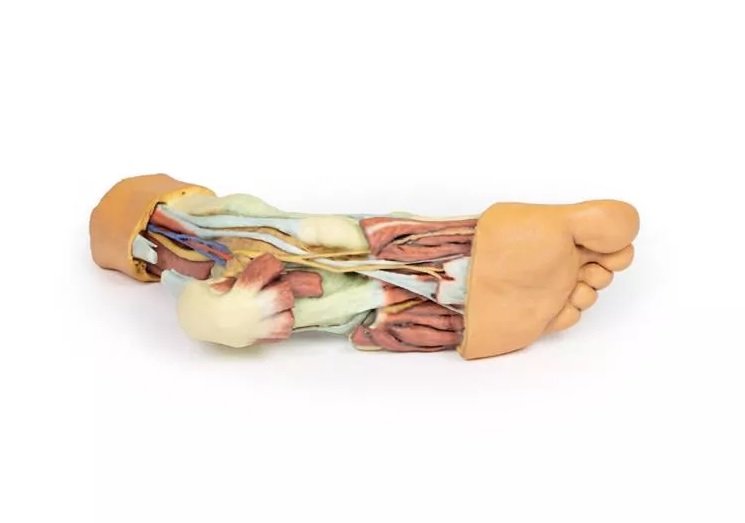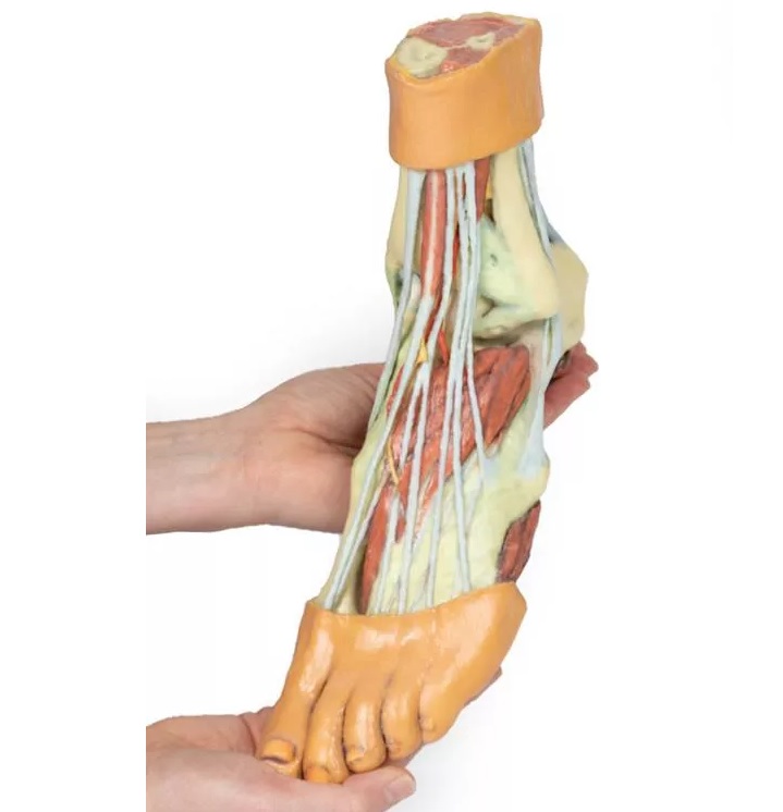 Tento model vytvořený 3D tiskem zobrazuje anatomii levé distální části bérce a hluboké struktury plantární plochy chodidla. Na kraniálním řezu lze rozpoznat holenní a lýtkovou kost, meziprstní štěrbinu a svaly nohy. Mediálně, na úrovni hlezenního kloubu, jsou nad kapsulárním vazivovým aparátem a extrakapsulárními vazy patrné dlouhé šlachy dorzálních extenzorů a plantárních flexorů.