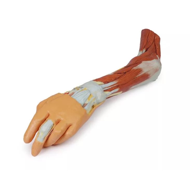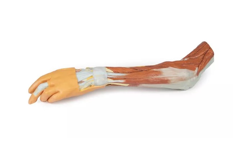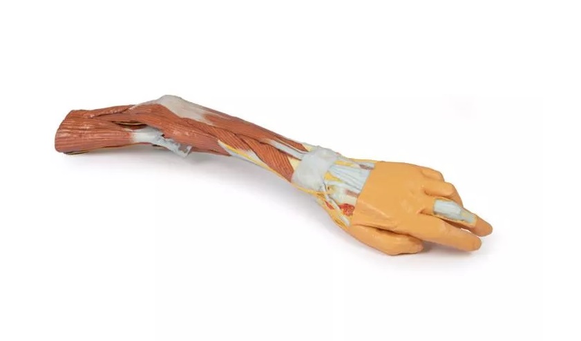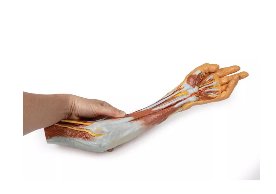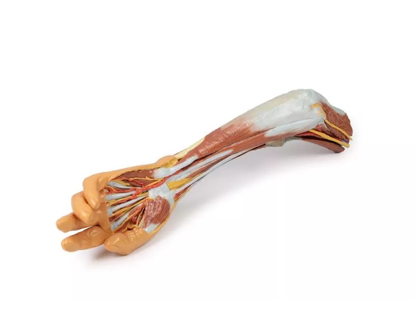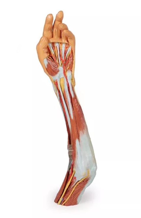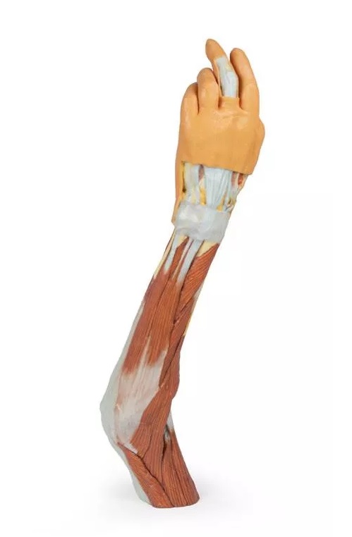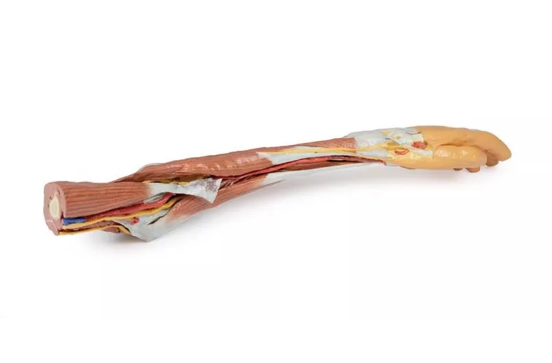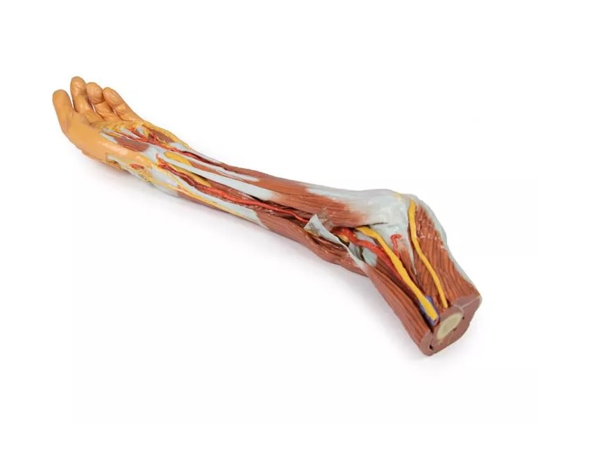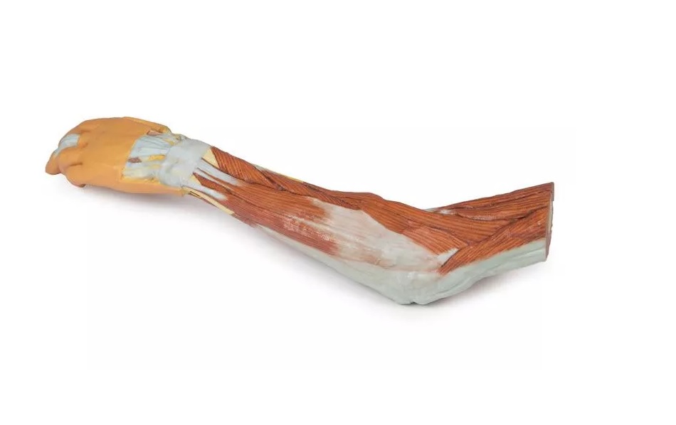 Tento 3D vytištěný model zobrazuje velkou část anatomie horní končetiny. V oblasti distálního ohybu horní končetiny a lokte/lokte ukazuje uspořádání šlachy bicepsu, pažní tepny a středového nervu od laterálního k mediálnímu. Aponeuróza bicepsu byla rozdělena tak, aby byly vidět základní struktury.