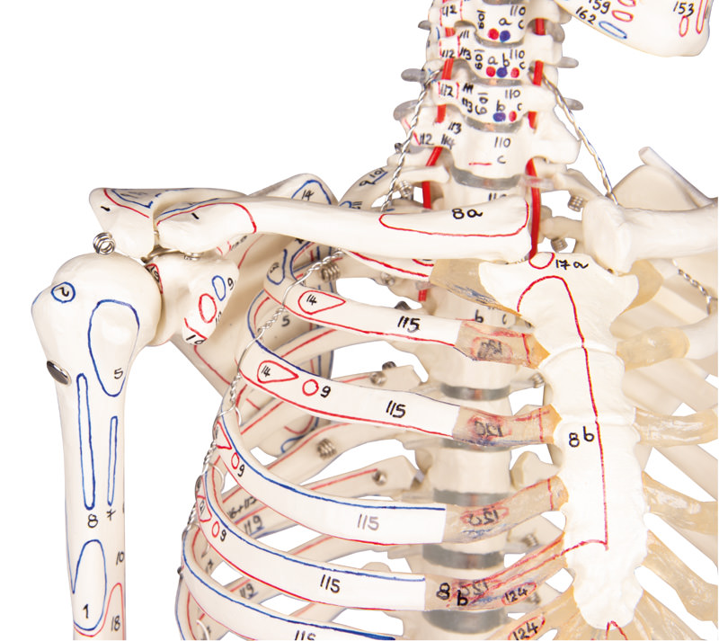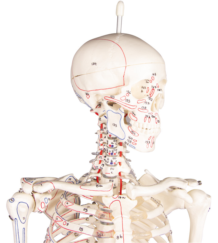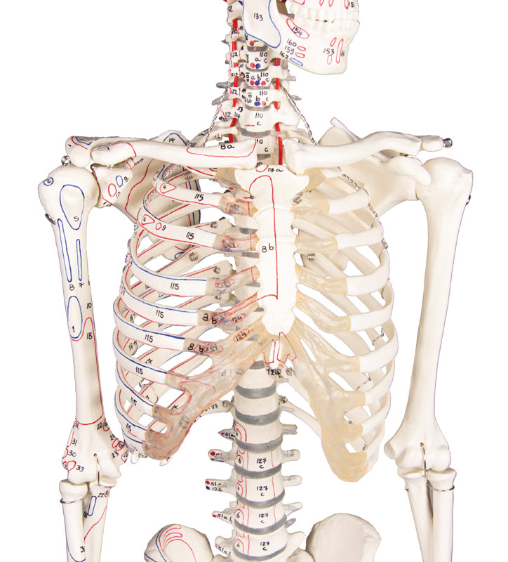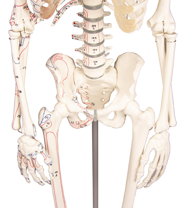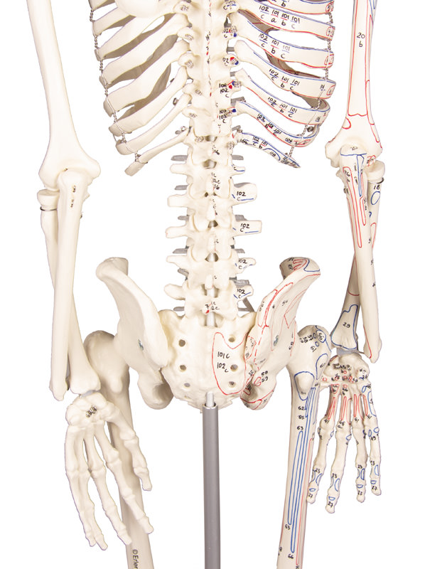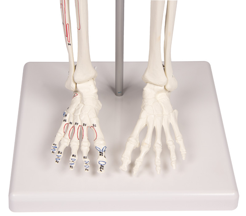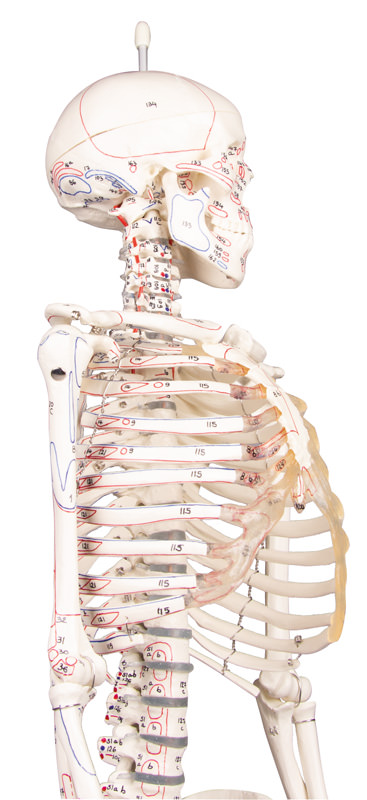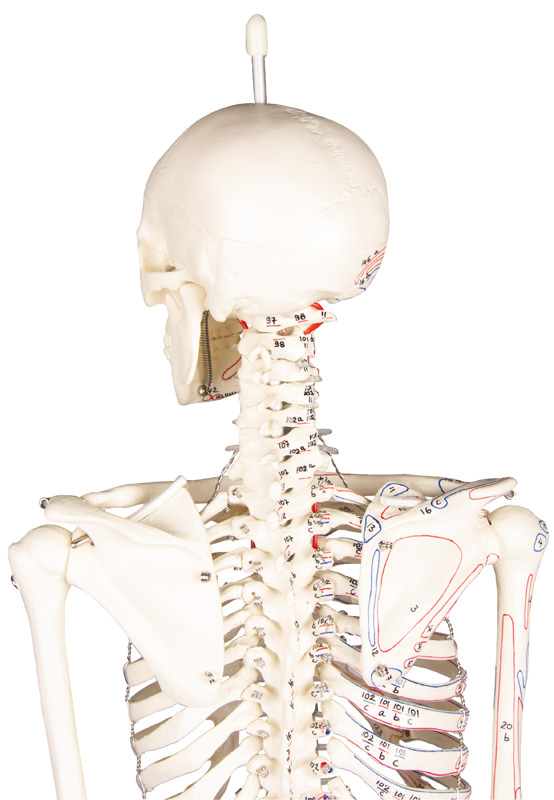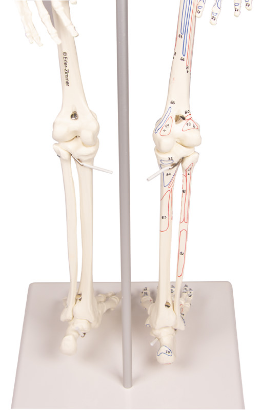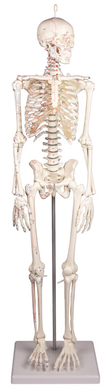 Zmenšený model lidské kostry v přibližně poloviční velikosti. Paže a nohy jsou plně pohyblivé. Ramenní, kyčelní, kolenní a kotníkové klouby jsou namontovány jako pohyblivé, aby umožňovaly přirozený pohyb. Třídílná lebka i ruce a nohy jsou odnímatelné. Dolní končetiny demontovatelné v koleni a kotníku. Svalové úpony a počátky jsou barevně označeny. Umístěno odnímatelném na stojanu.