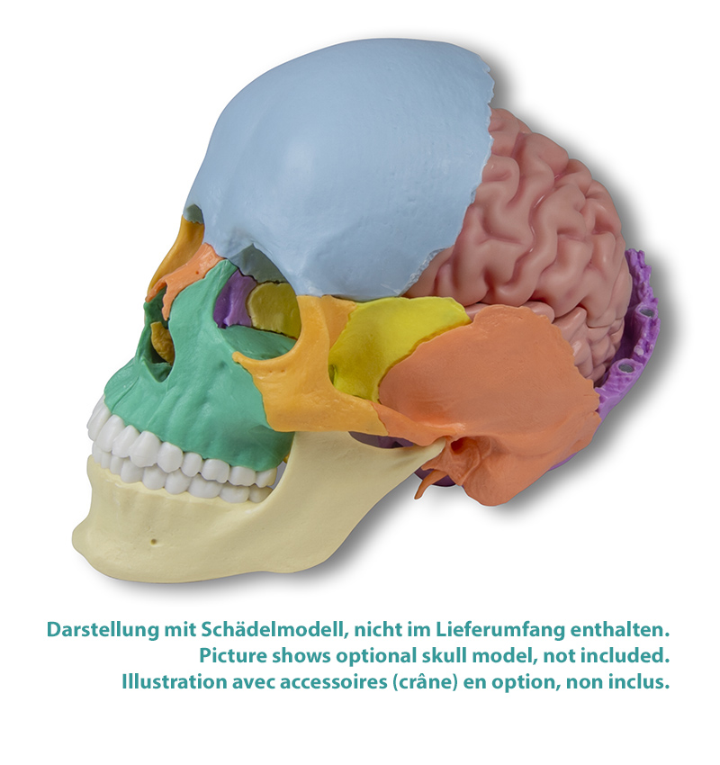 Mozek v životní velikosti je pečlivě namalován realistickou barvou zobrazující hlavní anatomii mozku. Tento model se perfektně hodí k našim modelům lebek EM270-4500, EM270-4505, EM270-4508, EM270-4509, EM270-4512, EM270-4514, EM270-4701 a EM270-4708 a model falx cerebri č. EM270-C925.