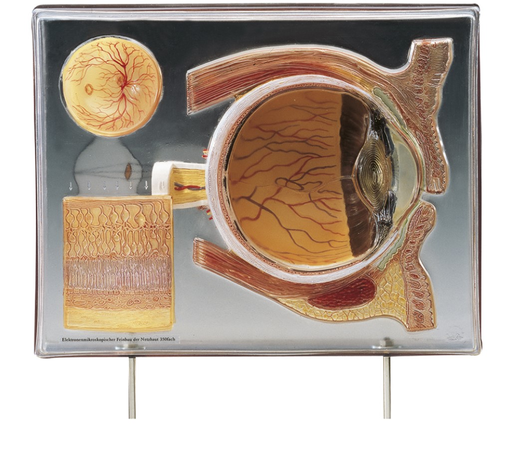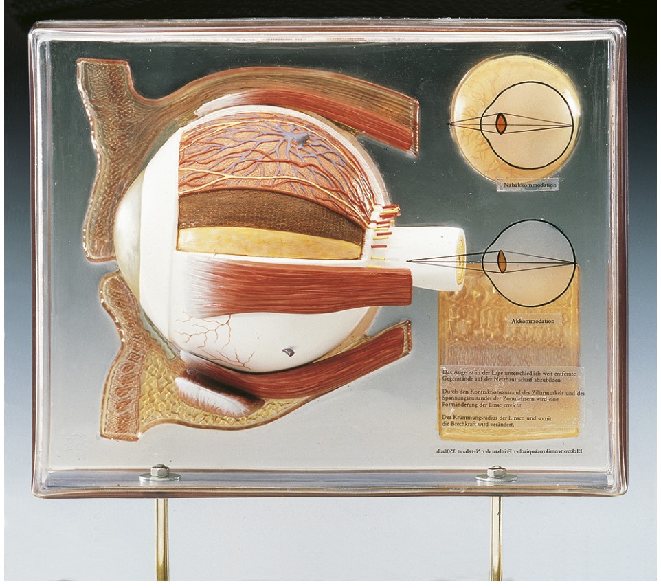 Oko je zvětšeno cca 6x, vyrobeno ze speciálního plastu ve vitrínce. Na model oka je oční důlek v sagitálním řezu na jedné straně. Kromě toho je odděleně zobrazen oční fundus a elektronově mikroskopická jemná struktura sítnice. Na druhé straně modelu je zobrazena oční bulva (ø 15,8 cm) s úpony svalů. nerozložitelné.
