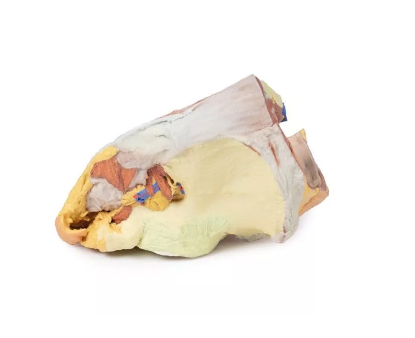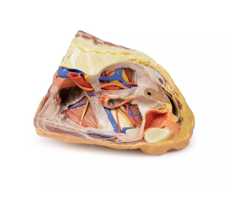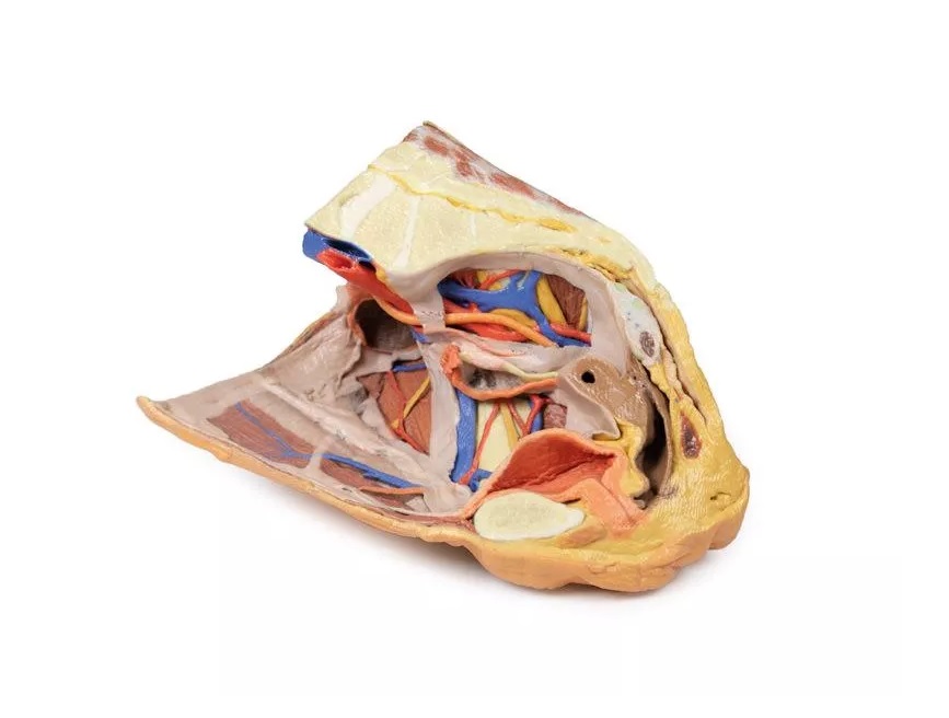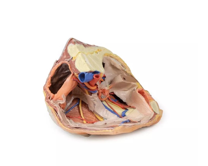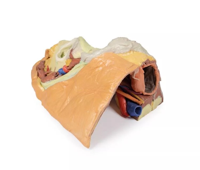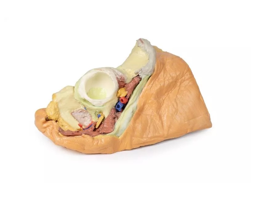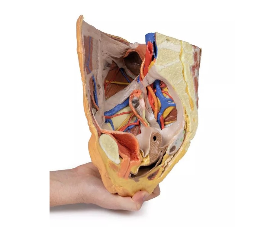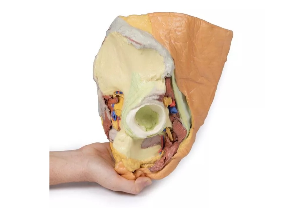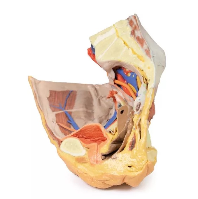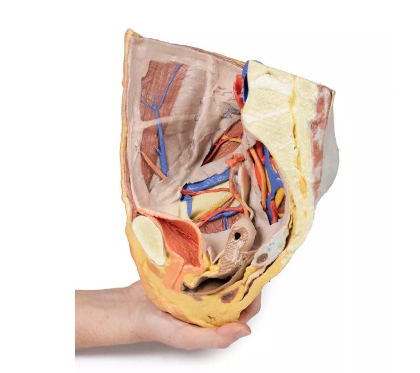 Tento 3D tištěný model pravé části ženské pánve zobrazuje povrchové i hluboké struktury malé a velké pánve, jakož i tříselný vaz, membrana obturatoria (vazivová blána) a Canalis obturatorius a velký a malý sedací otvor. Poněkud unikátní je odstranění části pobřišnice (šedá barva) pro vytvoření „okénka“ zobrazujícího extraperitoneální struktury.