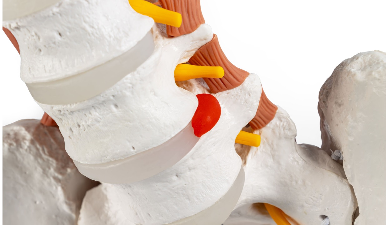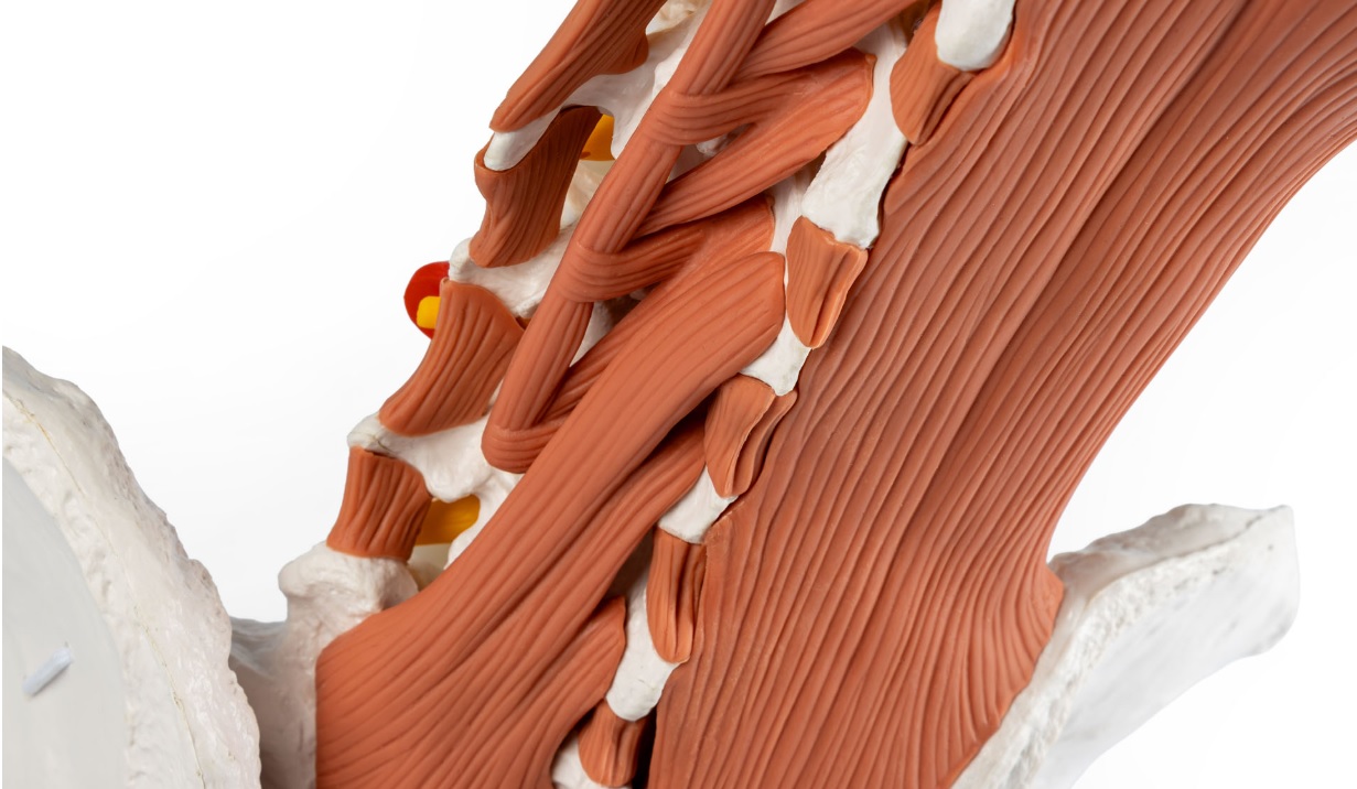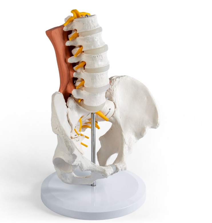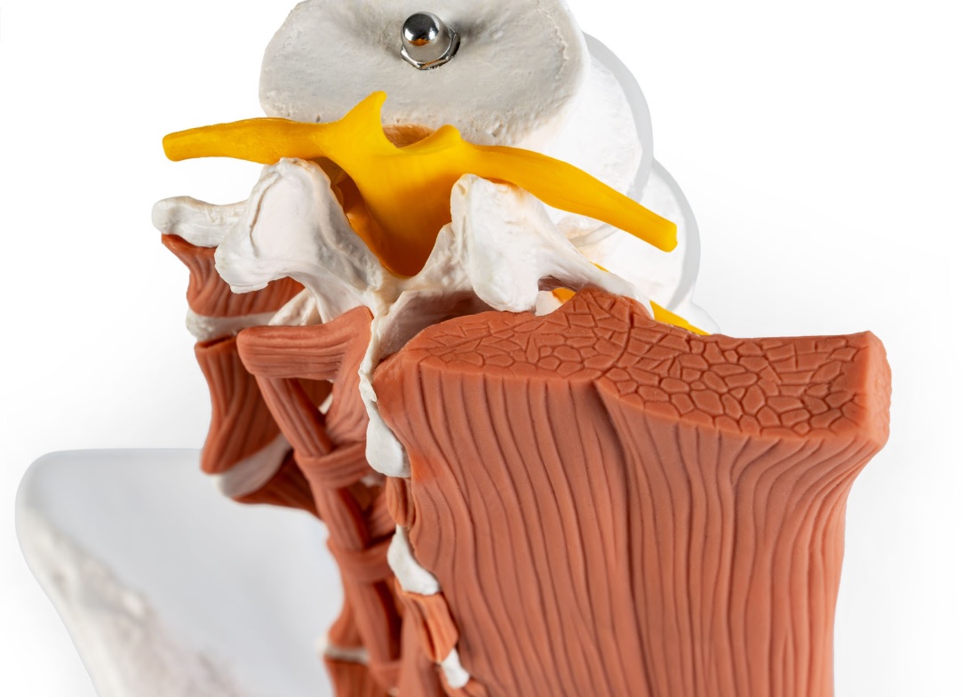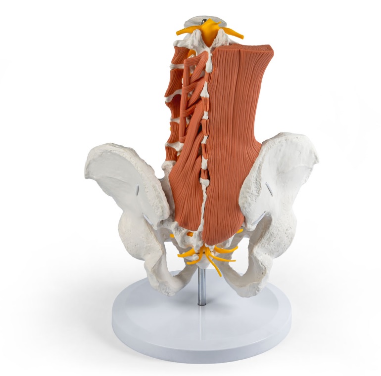 Model detailně zobrazuje povrchové a hluboké svaly v oblasti bederní páteře. Mícha a související míšní nervy jsou jasně viditelné, což usnadňuje pochopení anatomických vztahů.