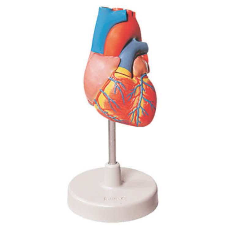 model lidského srdce životní velikosti obsahuje odnímatelnou srdeční stěnu pro odhalení levé a pravé komory a předsíně, ale i trikuspidální, pulmonární, mitrální a aortální chlopně, na stojanu