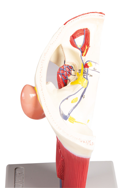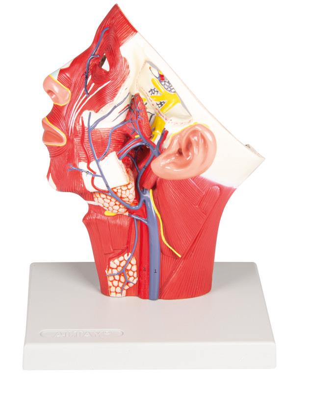 Na modelu hlavy je znázorněna levá vnitřní krční žíla v oblasti krku a hlavy, včetně přítokových žilních větví. Upevněno na podstavci.