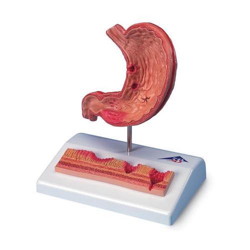 Model znázorňuje různá stádia gastritidy, od lehkého žaludečního vředu až po perforaci, řez žaludkem s jícnem a dvanácterníkem v poloviční velikosti obsahuje tyto patologie: erytematózní gastritida, erozivní gastritida, hemoragická gastritida, stádium hojení se zjizvením, atrofická gastritida, krvácející vřed a perforovaný vřed, navíc zvětšená žaludeční stěna zachycuje: zdravou sliznici, akutní gastritida v antrální oblasti, erozivní gastritida s defekty sliznice, krvácející vřed, perforovaný vřed, na podstavci.