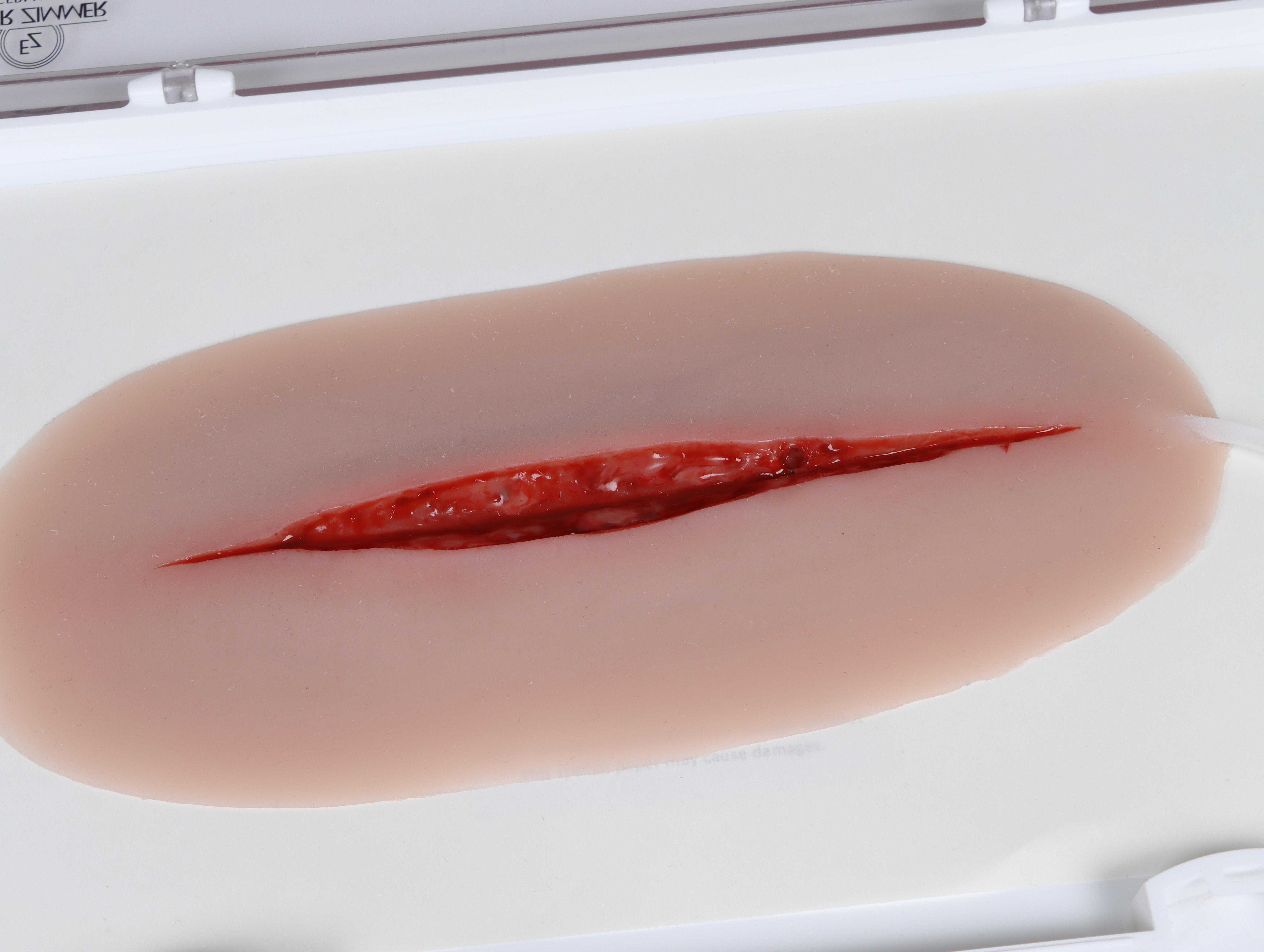 Tato silikonová imitace poranění zobrazuje sebevražedné poranění dolní části paže, při kterém byla podélně rozříznuta tepna. Poranění má přívodní cévu s přípojkou pro krvácivý systém. Imitace rány je samolepicí, lze ji nalepit na figurínu i na lidskou kůži. Ránu lze také aplikovat pomocí lepidla na kůži, ale pak muláž ztratí své samolepicí vlastnosti. Baleno v plastovém boxu.