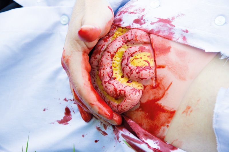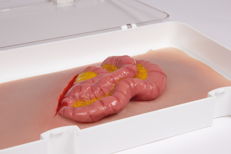 Imitace poranění- vyhřezlé tenké střevo po poranění břišní stěny. Imitace rány je samolepicí, lze ji nalepit na figurínu i na lidskou kůži. Ránu lze také aplikovat pomocí lepidla na kůži, ale pak muláž ztratí své samolepicí vlastnosti. Baleno v plastovém boxu.
