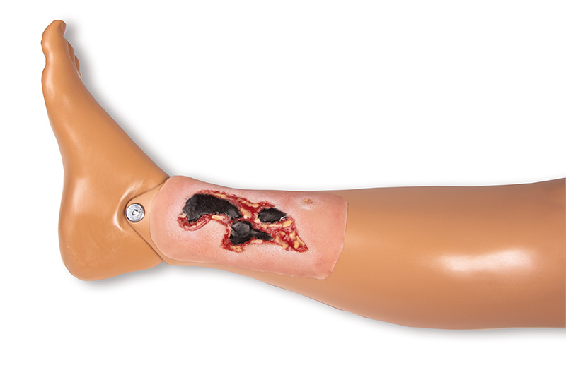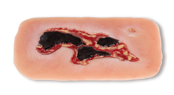 Tato samolepící rána představuje arteriální bércový vřed, defekt substance v tkáni dolní končetiny v důsledku periferního arteriálního okluzivního onemocnění (PAOD). V důsledku nedostatečného prokrvení a s ním spojeného nedostatečného zásobení kyslíkem je hojení ran zpomaleno, jakákoli drobná poranění se mohou stát chronickými ranami. V této mulaci je nekróza tkáně znázorněna jako rozsáhlé černé plochy. Tato malá rána je ideální pro přiložení na kotník nebo bérec a přilne sama. Pro delší použití ji lze fixovat speciálním kožním lepidlem. Všechny materiály použité v tomto výrobku jsou dermatologicky nezávadné.