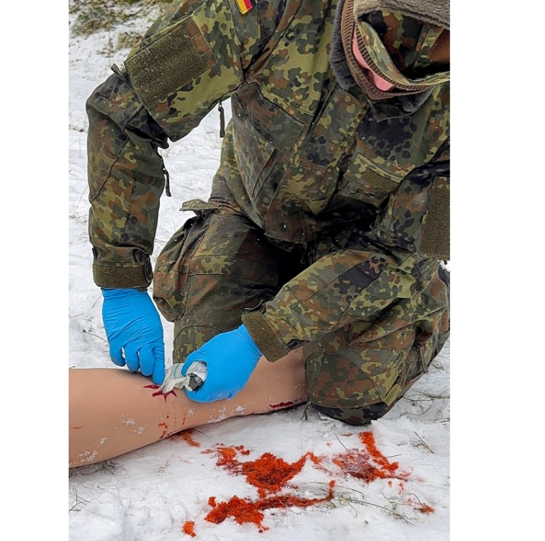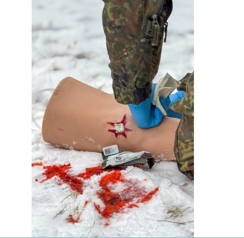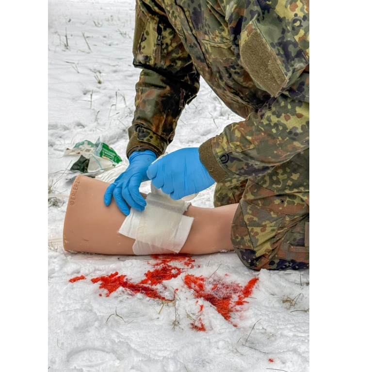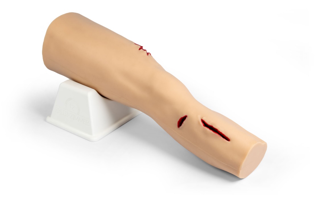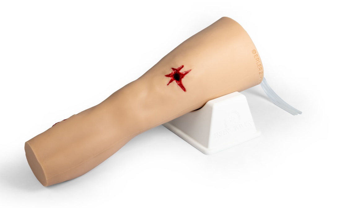 Simulátor reprodukuje čtyři arteriální krvácivé rány – vstupní a výstupní střelnou ránu (femorální tepna), řeznou ránu (přední tibiální tepna) a bodnou ránu (tibiální tepna). Podporuje aplikaci širokého a těsného proximálního škrtidla (turniket) v souladu s pokyny TCCC, stejně jako ošetření ran. Vnitřní jádro simuluje kostní strukturu, zatímco odolná silikonová hmota umožňuje opakované použití v náročných tréninkových podmínkách. Nezávislé ruční ovládání ventilu pro každou ránu umožňuje nastavit různé scénáře krvácení. Anatomicky správná velikost vychází z antropometrie nohy dospělého člověka a podporuje šířku škrtidla až 40 mm.