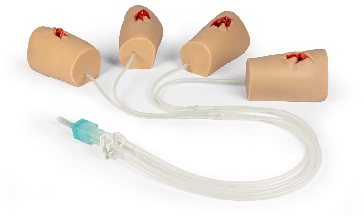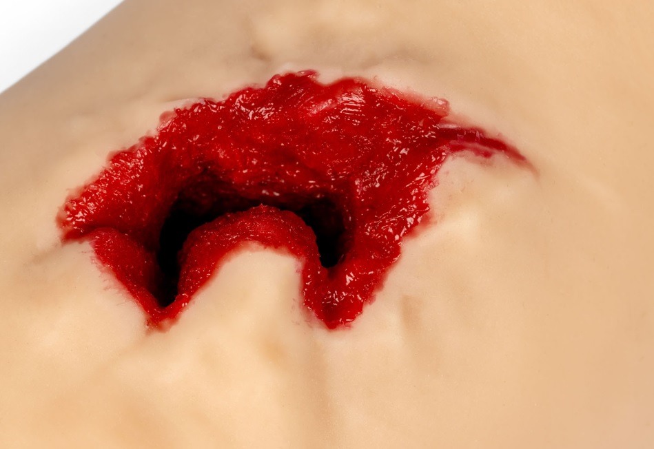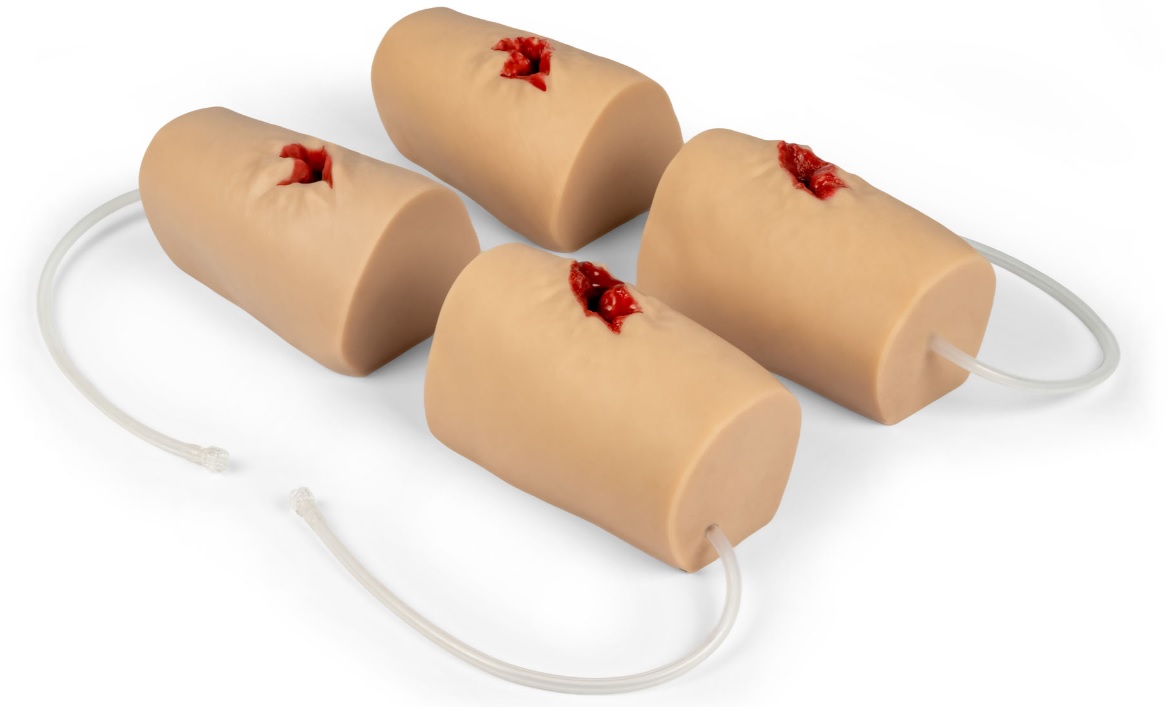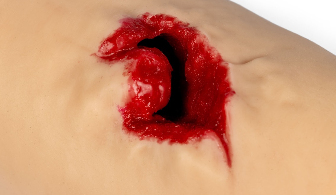 Cenově dostupný a realistický model střelného zranění s krvácením, způsobeným velkou ráží zbraně, ideální pro nácvik zástavy masivního krvácení.