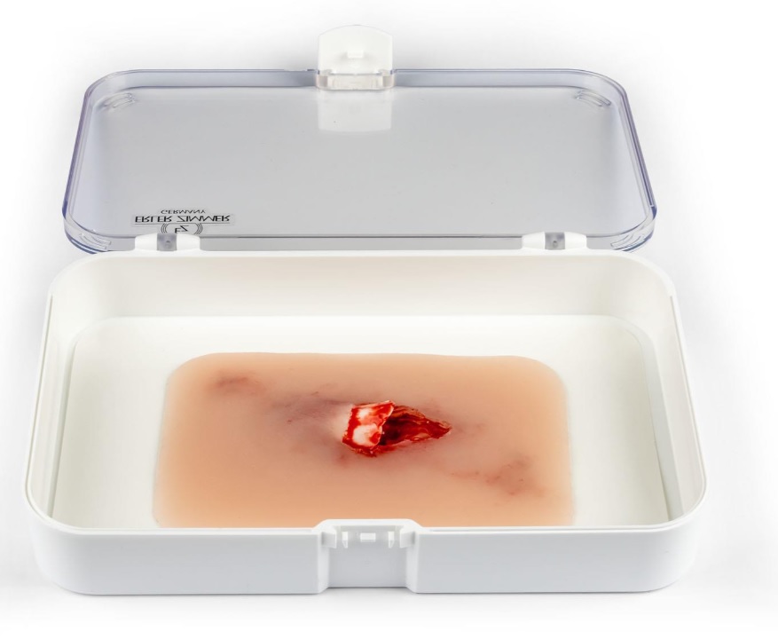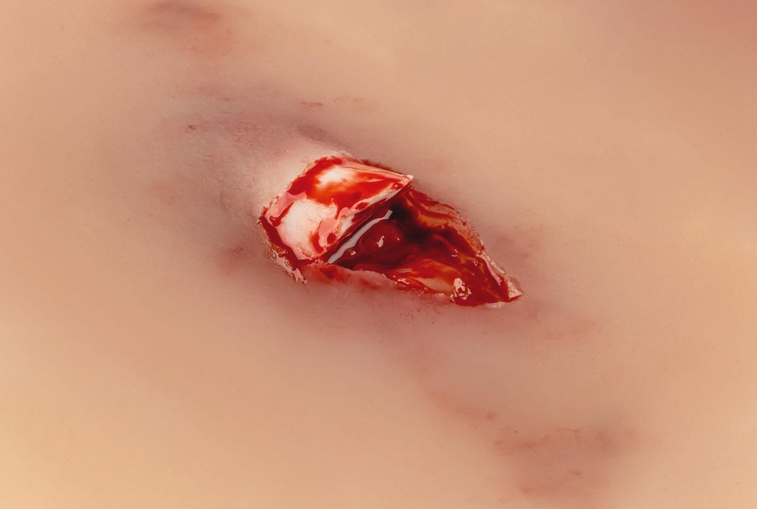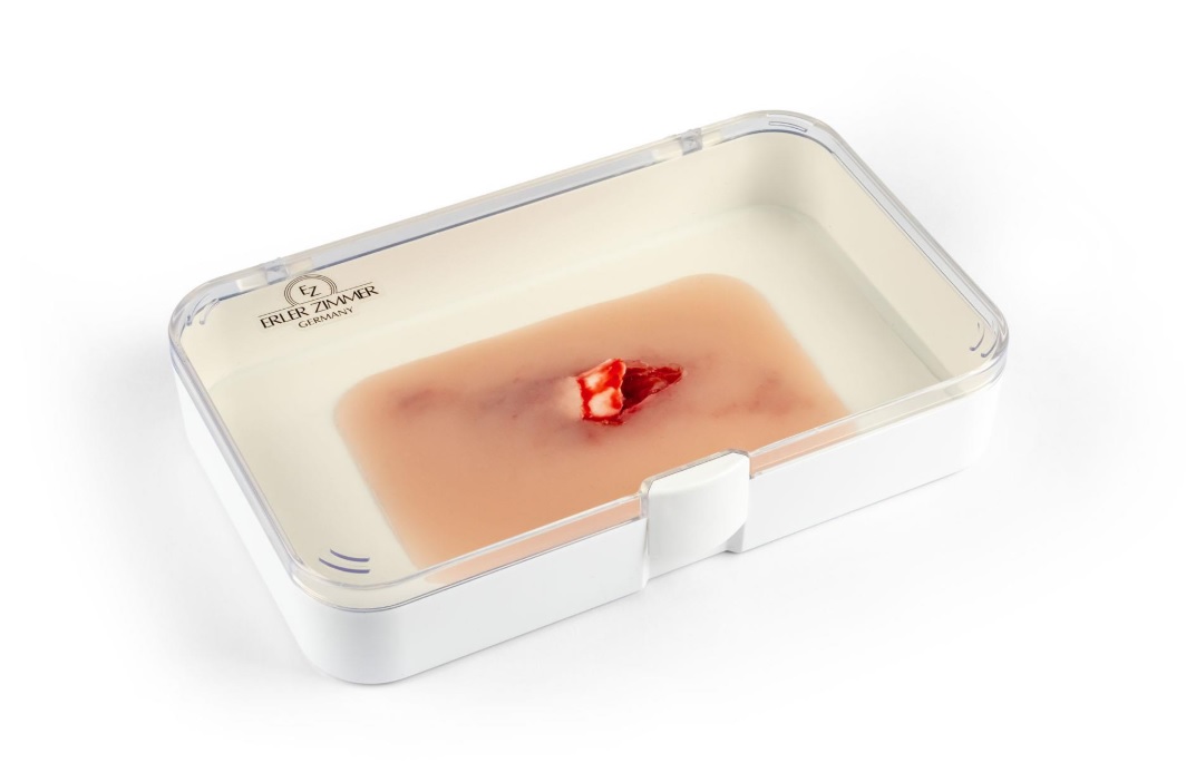 Imitace poranění otevřené zlomeniny části horní končetiny (např.předloktí). Imitace rány je samolepicí, lze ji nalepit na figurínu i na lidskou kůži. Ránu lze také aplikovat pomocí lepidla na kůži, ale pak muláž ztratí své samolepicí vlastnosti. Baleno v plastovém boxu.
