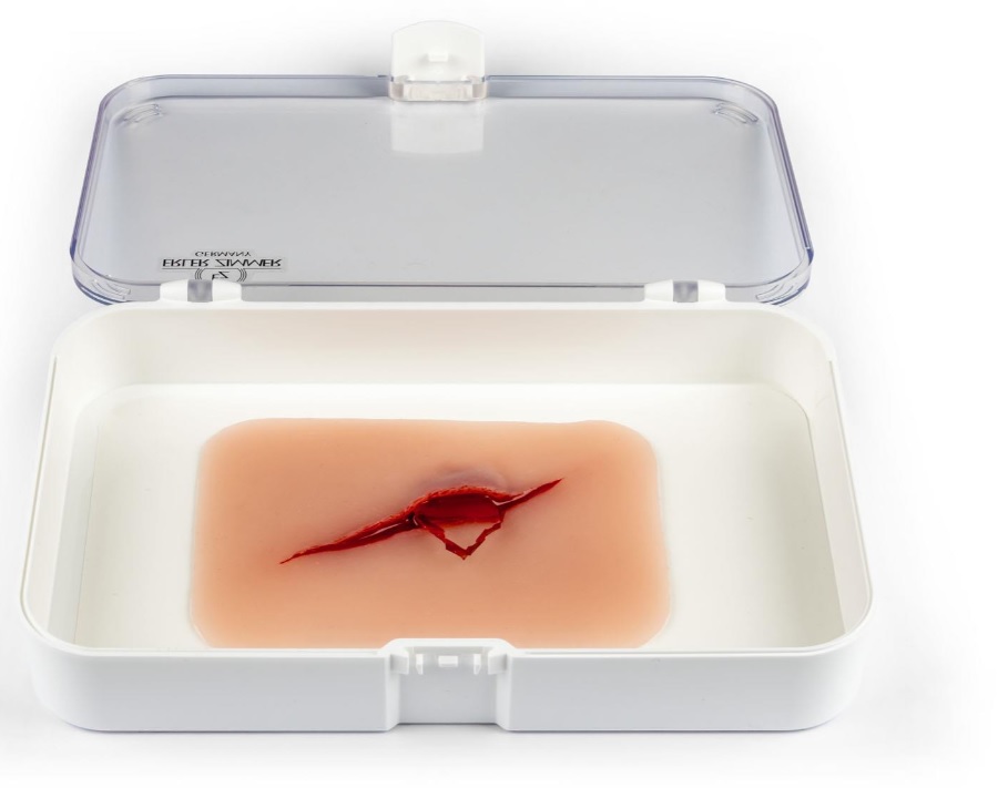 Imitace poranění - muláž zobrazuje řeznou ránu způsobenou střepem skla, které je stále v ráně. Skleněný střep vypadá realisticky, ale je vyroben z měkkého materiálu, takže nehrozí riziko poranění. Imitace rány je samolepicí, lze ji nalepit na figurínu i na lidskou kůži. Ránu lze také aplikovat pomocí lepidla na kůži, ale pak muláž ztratí své samolepicí vlastnosti. Baleno v plastovém boxu.