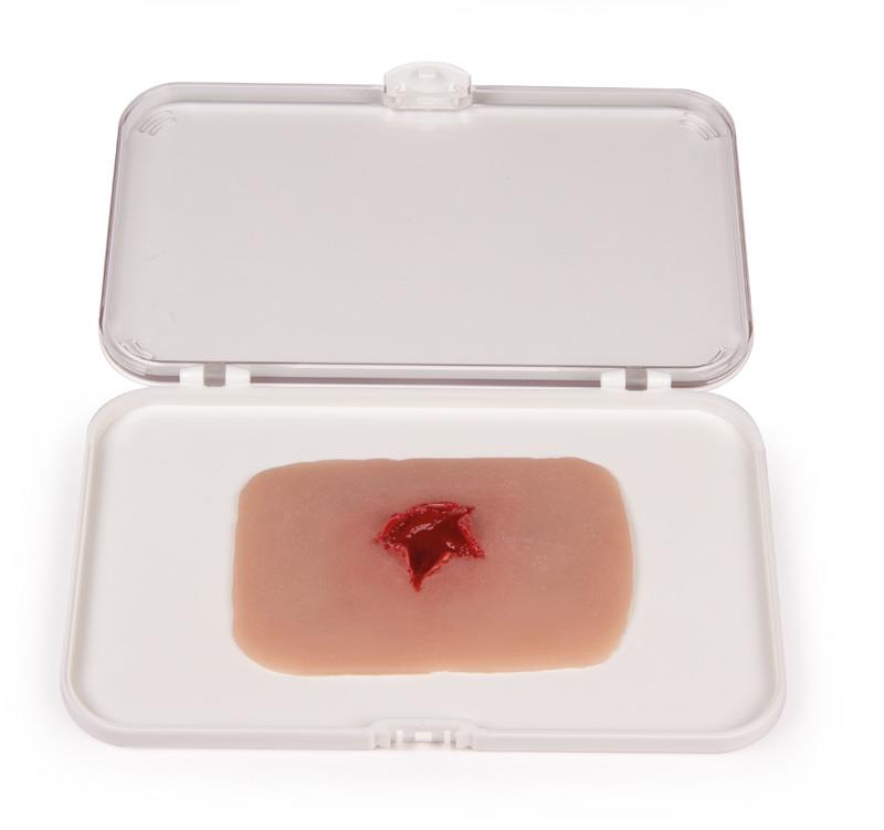 Imitace poranění - model zobrazuje střelné poranění, ránu při výstupu střely. Imitace rány je samolepicí, lze ji nalepit na figurínu i na lidskou kůži. Ránu lze také aplikovat pomocí lepidla na kůži, ale pak muláž ztratí své samolepicí vlastnosti. Baleno v plastovém boxu.