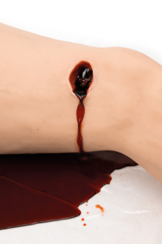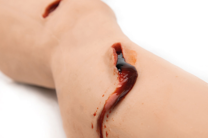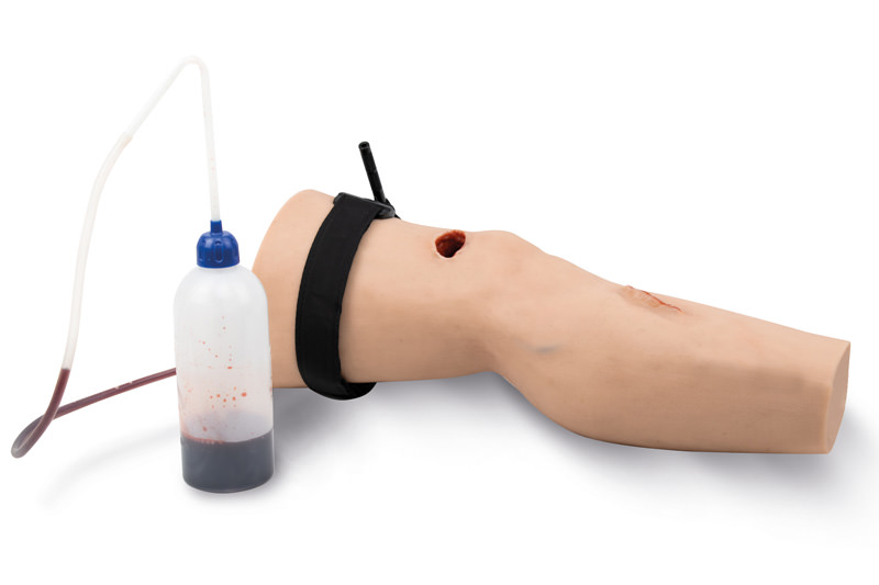 Nácvik první pomoci a zajištění silného krvácení pomocí trauma modelu dolní končetiny. Trenažér představuje poraněnou dolní končetinu s tržnými ranami, vstupní a výstupní střelnou ranou. Pro zastavení skutečného krvácení můžete použít přímý tlak, zajistit ránu gázou, přiložit tlakový obvaz nebo použít škrtidlo (škrtidlo není součástí balení).