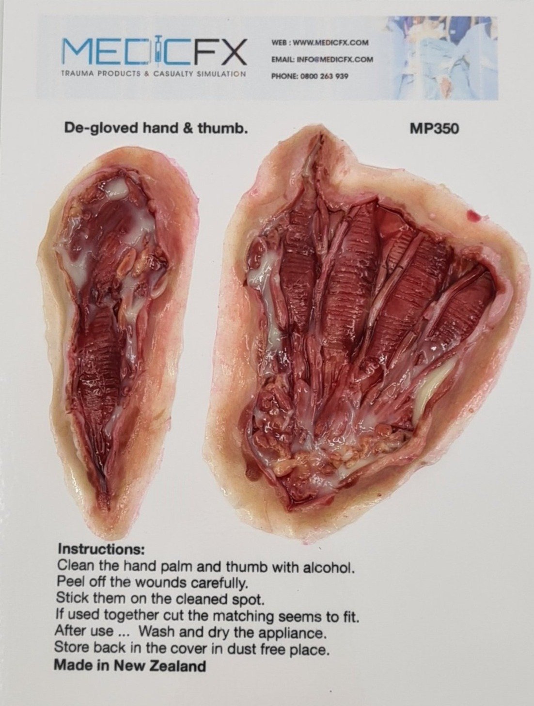 Silikonové nálepky imitace rány pro použití na figuríně nebo osobě. Tato imitace ruky může být způsobena zmrznutím nebo popálením.