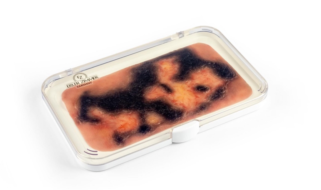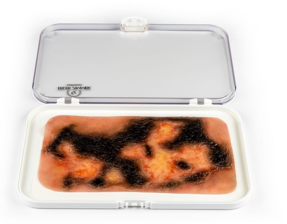 Imitace poranění - popáleniny 3. stupně se spálenou vrstvou kůže. Imitace rány je samolepicí, lze ji nalepit na figurínu i na lidskou kůži. Ránu lze také aplikovat pomocí lepidla na kůži, ale pak muláž ztratí své samolepicí vlastnosti. Baleno v plastovém boxu.