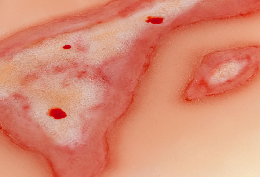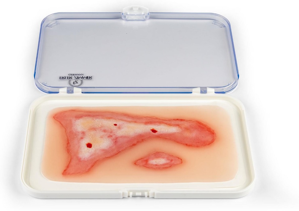 Imitace poranění - opaření. Imitace rány je samolepicí, lze ji nalepit na figurínu i na lidskou kůži. Ránu lze také aplikovat pomocí lepidla na kůži, ale pak muláž ztratí své samolepicí vlastnosti. Baleno v plastovém boxu.