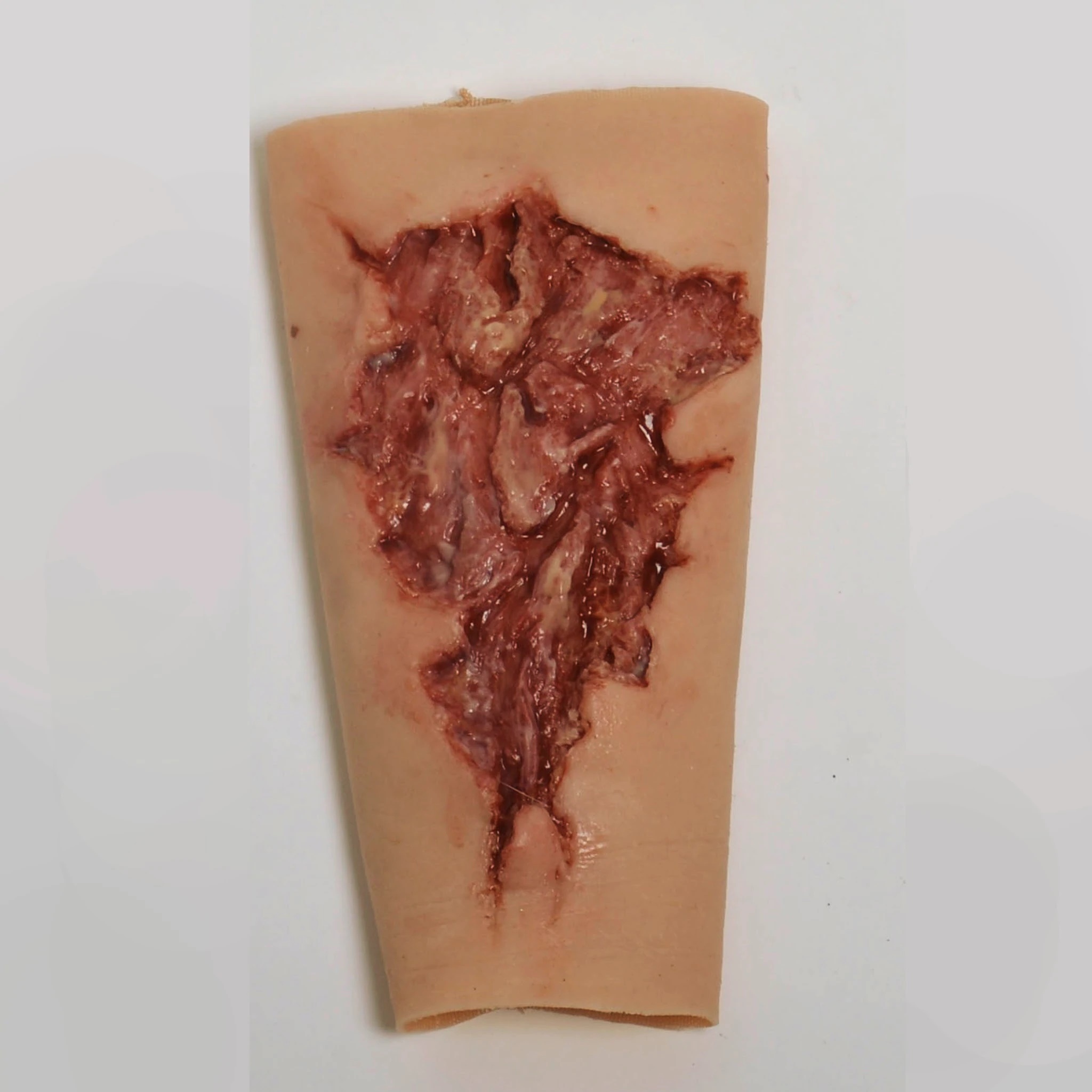 Tyto trauma návleky vypadají i působí realisticky. Jsou vyrobeny z měkkého silikonu podobného pokožce s vloženou síťovinou pro větší pevnost. Zadní strana má suchý zip a samostatnou podložku. Podkladová tkanina usnadňuje nastavení velikosti a aplikaci. Mnohé z našich návleků lze použít na různých místech těla figuranta nebo figuríny.