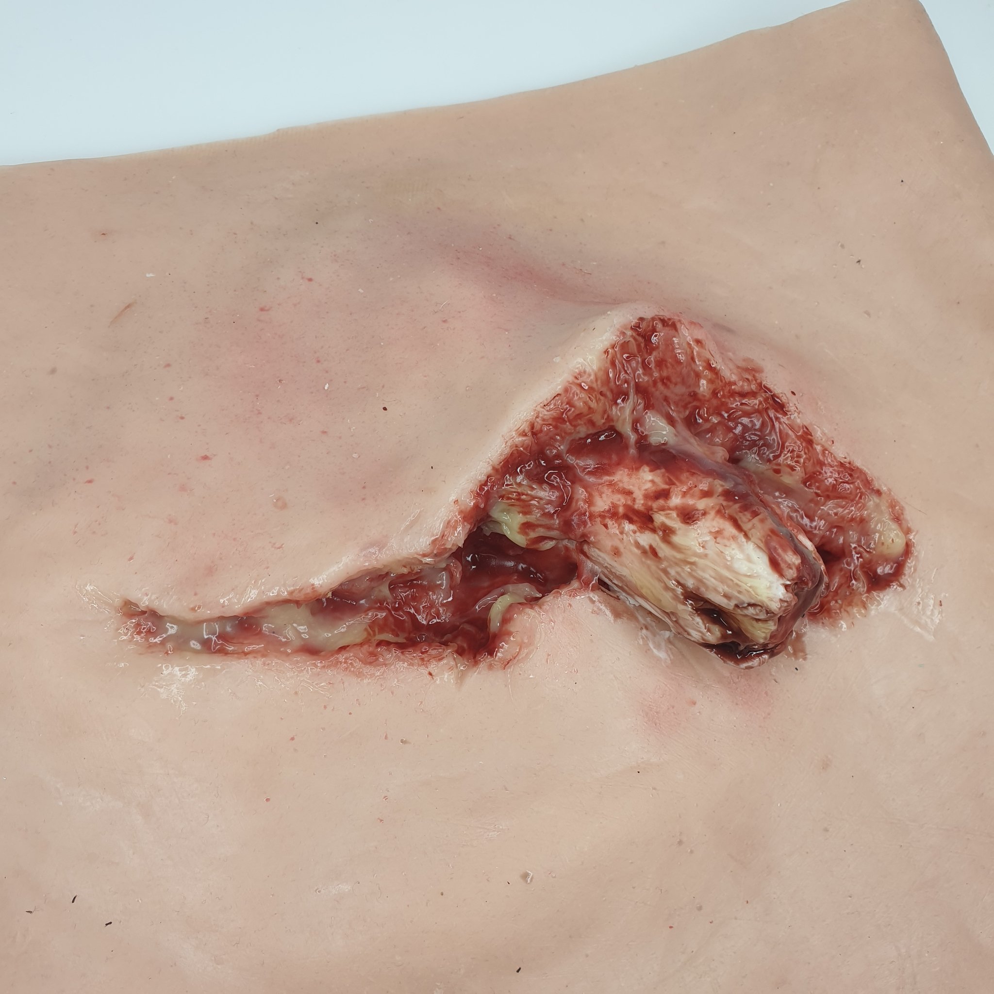 Nejrealističtější a nejuniverzálnější návleky imitací trauma zranění. Tyto trauma návleky vypadají i působí realisticky. Jsou vyrobeny z měkkého silikonu podobného pokožce s vloženou síťovinou pro větší pevnost. Zadní strana má suchý zip a samostatnou podložku. Podkladová tkanina usnadňuje nastavení velikosti a aplikaci. Mnohé z našich návleků lze použít na různých místech těla figuranta nebo figuríny. Produkt obsahuje: Silikonová manžeta se zraněním Podšívka Veltex Tento návlek lze objednat v různých odstínech pleti. Rozměry: 25 cm x 28 cm Hmotnost: 0,38 kg Materiály: Platinum silikon, síťovaný podklad, suchý zip, podklad Veltex