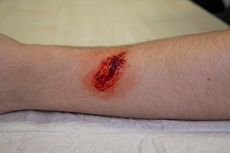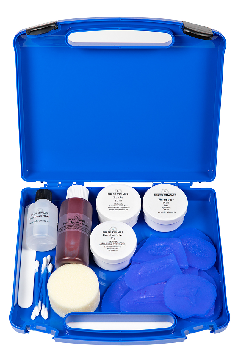 S touto sadou pro simulaci ran můžete během několika minut vytvořit realistická poranění pro výcvik první pomoci, a to i bez nutnosti líčení. Formy, které jsou součástí sady, lze plnit směsí pro simulaci ran tak často, jak je potřeba. Jakmile směs zaschne, jednoduše naplněné formičky přitlačte na požadované místo. Rány se samy přichytí na kůži nebo na cvičné figuríny, bez nutnosti použití lepidla. Jednoduše nanesete umělou krev na aplikovanou ránu a rána je hotová. Pro ještě realističtější efekt můžete na ránu přidat směs na simulaci ran. Aplikované rány lze ošetřit opakovaně; jednoduše sejměte obvaz, krátce opláchněte a nanesete umělou krev. Po výcviku lze umělou ránu snadno odstranit a zlikvidovat. Není nutné žádné čištění ani údržba. Spotřební materiál jako směs na simulaci ran, směs na simulaci umělé tkáně, fixační prášek a umělá krev jsou k dispozici i samostatně.