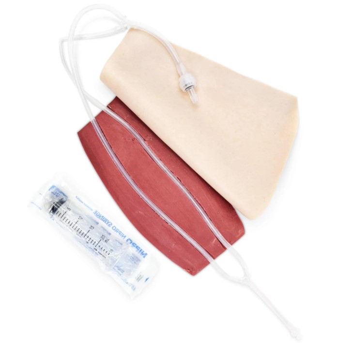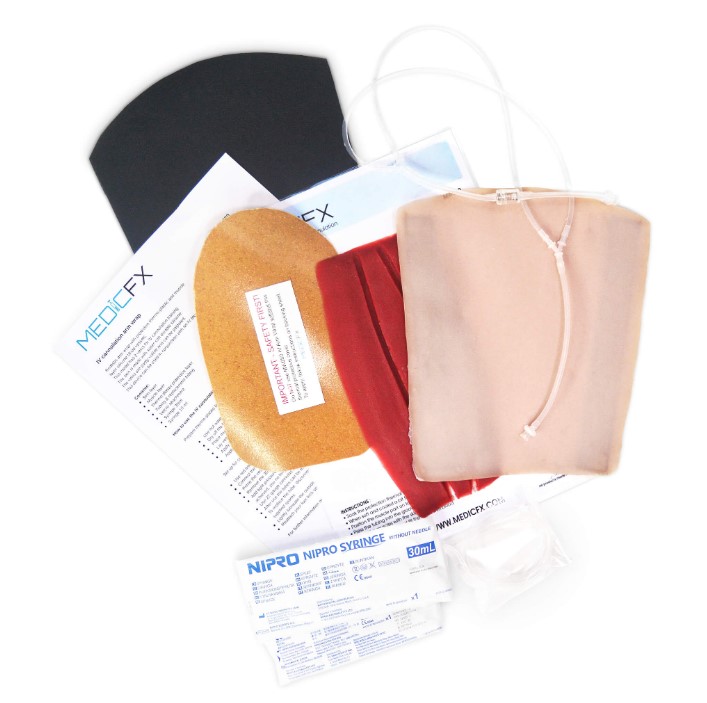 Návlek je vyroben ze vynikajícího měkkého silikonu s vloženou zakřivenou silikonovou trubičkou (varianta i bez hadičky). Žíly nejsou viditelné, ale lze je nahmatat přes kůži. Procvičte si IV zavedení nebo odběr krve. Je vhodný pro použití na osobě i na figuríně. Termoplastická fólie chrání rameno před proražením. Plast stačí zahřát v horké vodě a omotat kolem paže