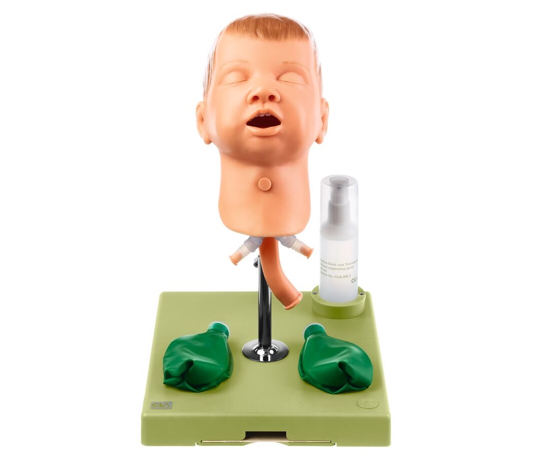 Součásti pediatrického simulátoru tracheotomie: dětská hlava s očima, ucho s vnějším zvukovodem, zuby, tracheostomie, jícen a průdušnice s hlavními průduškami, 2 plíce a 2 bronchiální zátky pro hlavní průdušky. Odnímatelné, upevněné na stojanu se zelenou základnou. Včetně 125 ml silikonového spreje.