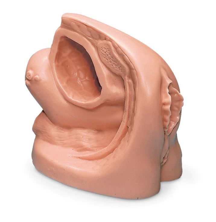 Anatomie zahrnuje konečník, dělohu, močový měchýř, pánevní kost, sval svěrače močové trubice, klitoris, ústí močové trubice, malé stydké pysky, pochvu, velké stydké pysky, pánevní bránici a konečník. Model používá jakýkoli katétr velikosti 16 FR nebo menší.