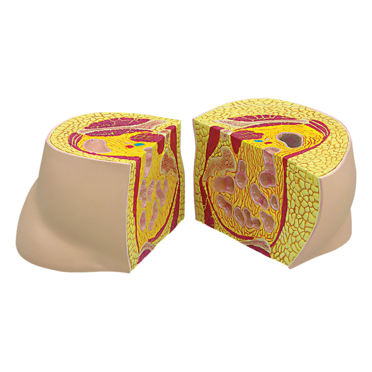 Tuk v našem těle posuzujeme podle toho, jak vypadáme zvenčí. Tento průřezový model boků nám umožní chytře nahlédnout na problém, který se nachází uvnitř těla. Model znázorňuje v průřezu oblasti kyčle tvar těla jako hruška a jablka. Tvarem hrušky se označuje tuk ve spodní části těla. Ten se skládá hlavně z podkožního tuku. Tvar jablka poukazuje na tuk uvnitř břicha. Ten může být tvořen viscerálním a podkožním tukem. Model zobrazuje účinky obezity, jako tlak viscerálního tuku na tlusté střevo, kyčelní tepnu a žíly, močovod, tenké střevo, stehenní nerv, atd. Vzdělávací karta s popisy zobrazuje část těla ve tvaru jablka, hrušky a normální části těla v jedné úrovni.