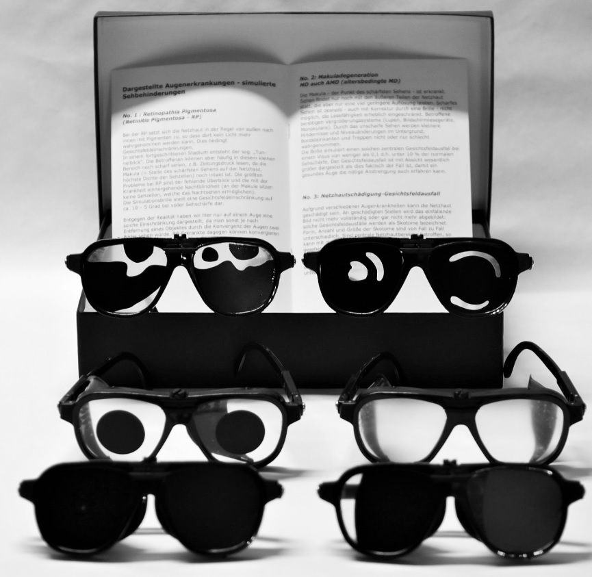 Sada obsahuje 6 brýlí simulujících onemocnění zraku běžných ve stáří: 1) Retinitis pigmentosa- soubor dědičných očních poruch, 2) makulární degenerace ve stáří, 3) retinopatie-závažné onemocnění cév oční sítnice, 4) odchlípení sítnice, 5) atrofie optického nervu 6) katarakta- šedý zákal