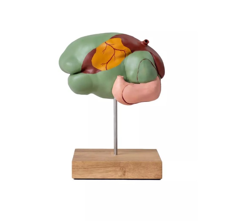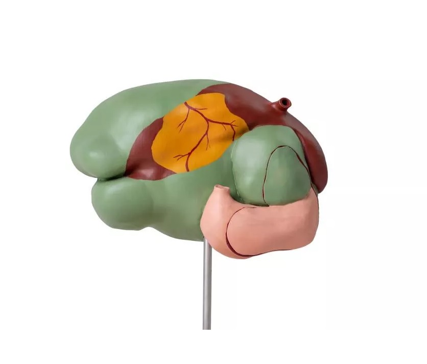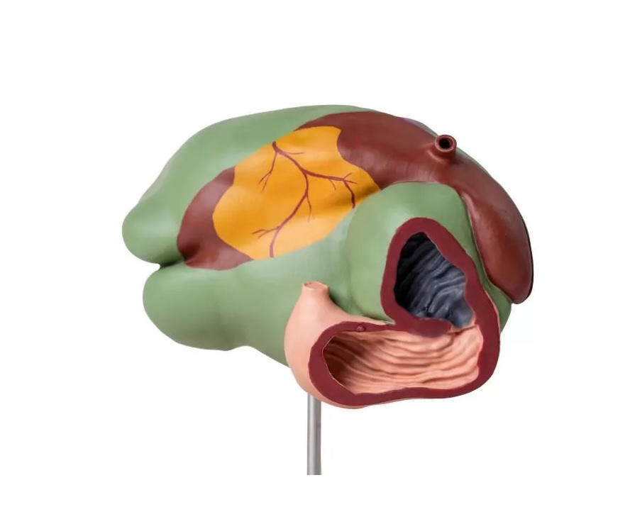 Bachor a retikulum lze rozdělit na dvě poloviny, aby byl vidět povrchový reliéf sliznice žaludku. Omasum (třetí předžaludek) a abomasum (slez) lze otevřít. Model je na podstavci a skládá se ze 3 částí.