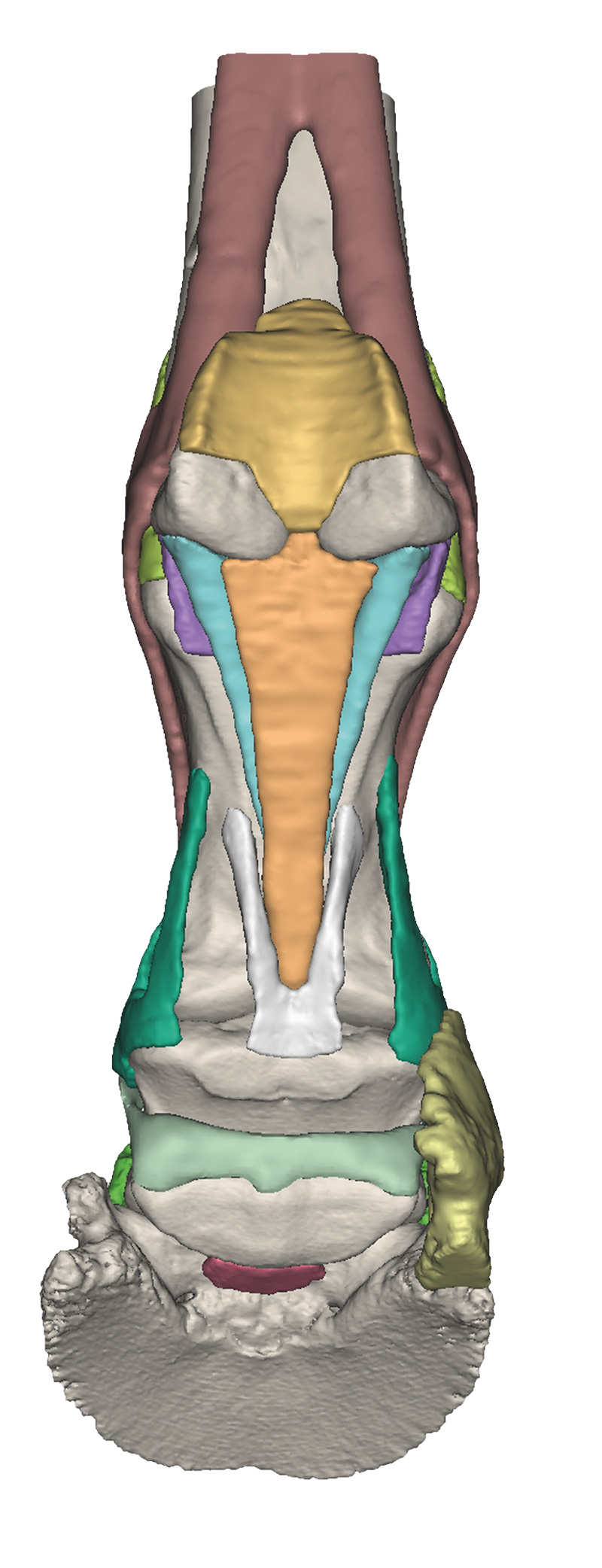 Tento model nohy koně je anatomicky přesný, odvozený z dat CT a MR snímků, v životní velikosti. Jedná se o 3D tisk v plných barvách. Každá anatomická součást je individuálně barevná. Kopyto je k dispozici samostatně (EM270-VET4400-1).