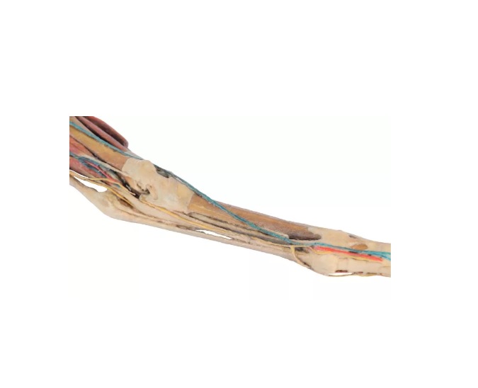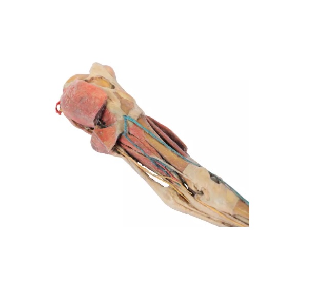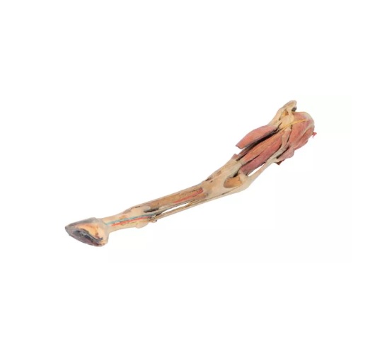 Model zobrazuje povrchový řez svalovinou nohy od poloviny stehna po kopyto. Pouzdro kyčelního a tarzálního kloubu bylo otevřeno, aby bylo možné demonstrovat menisky, hlavní vazy a topografii šlach. Svaly extenzorů a flexorů těchto kloubů a také kloubů nohy byly rozřezány ve stehenní a holenní kosti až po šlachy v tarzu, metatarzu a falangách. Nervy a cévy byly vypreparovány v podkolenní jamce, v oblasti nártu a kopyta. Podrobný anatomický popis na vyžádání.