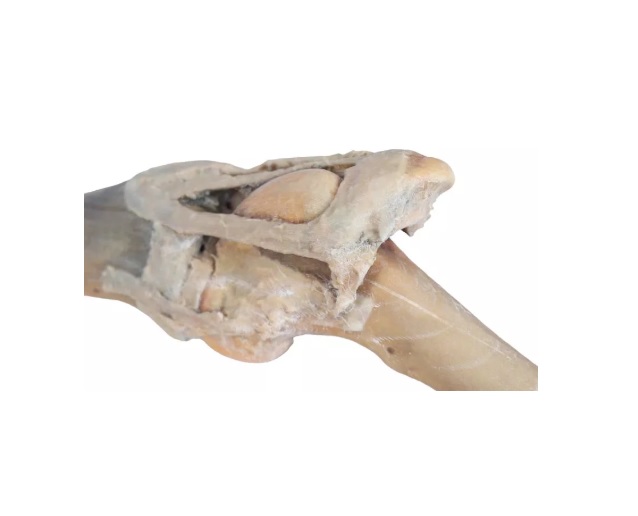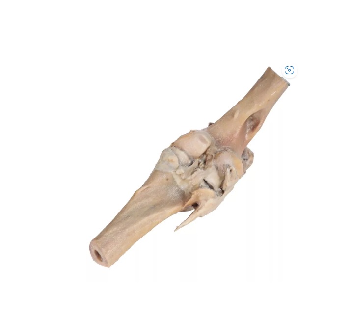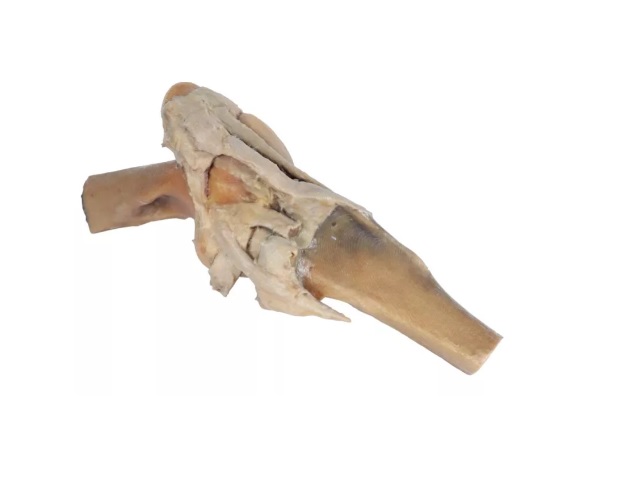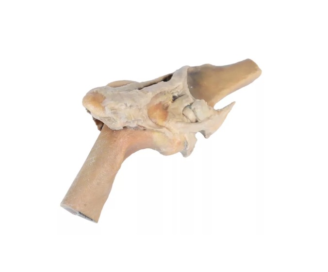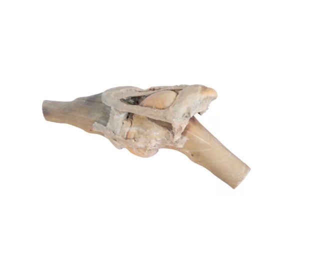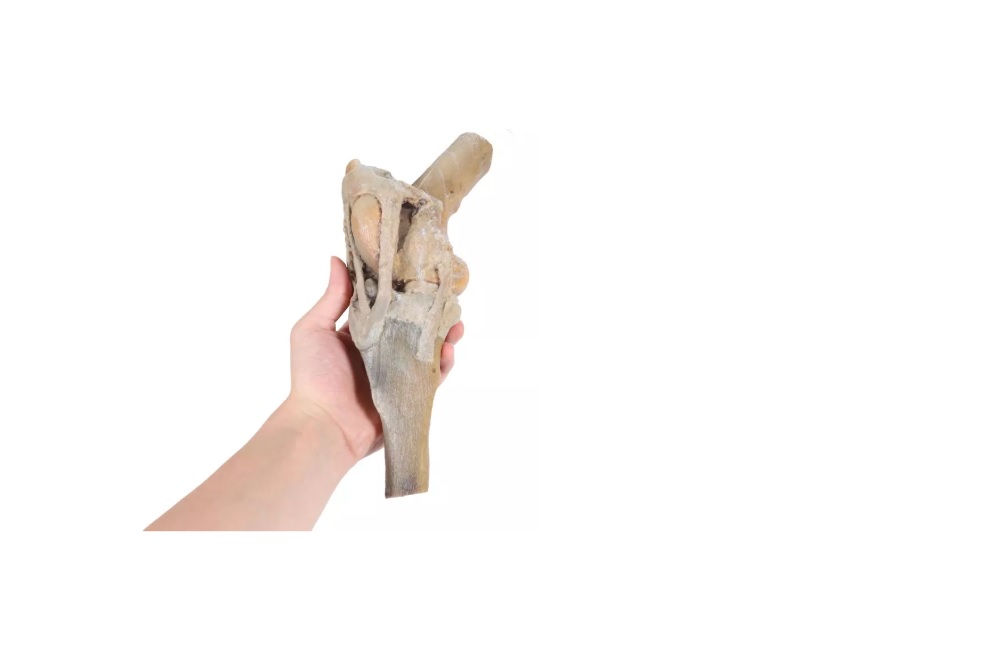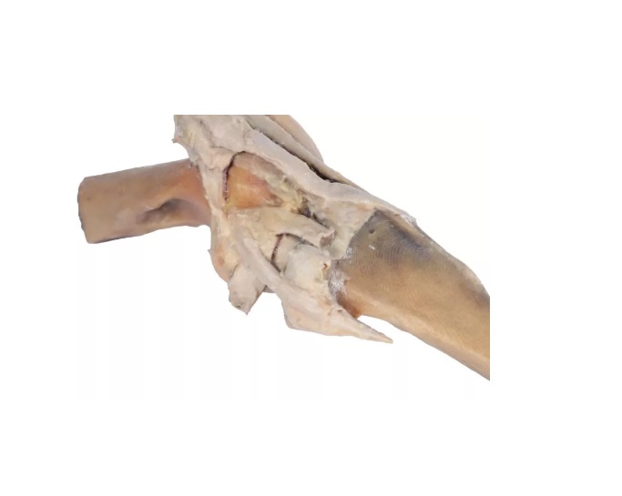 Model demonstruje vazy kolenního kloubu s nohou v extenzi (natažení). Při pohledu zepředu s čéškou a třemi čéškovými vazy. Viditelné jsou mediální a laterální menisky, kaudální zkřížený vaz, femoropatelární vaz a kolaterální vazy.