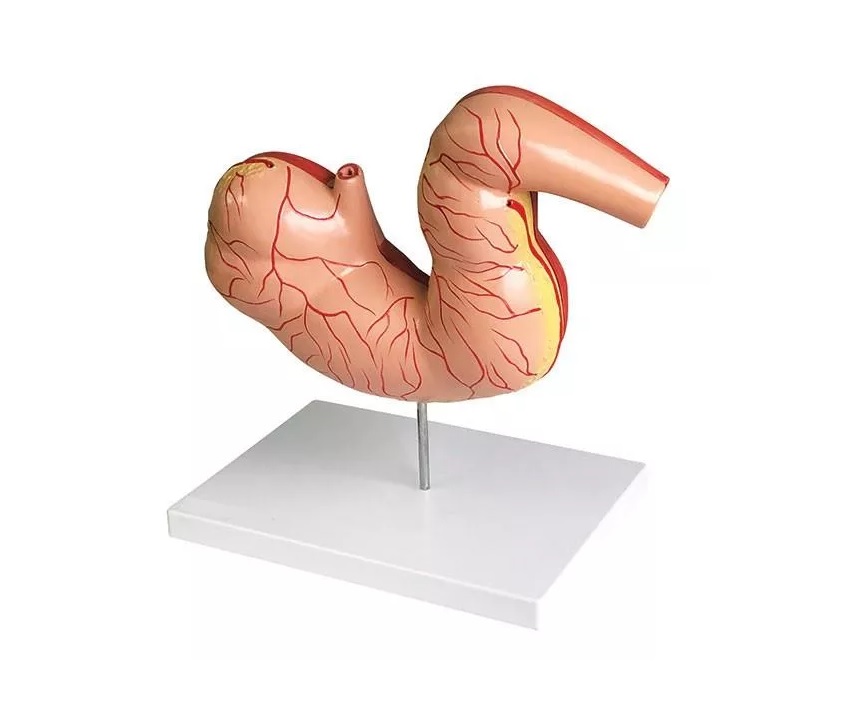 Realistický model koňského žaludku lze rozdělit na 2 části. Můžeme tak vidět vnitřní a vnější strukturu žaludku. Model je upevněn na podstavci.