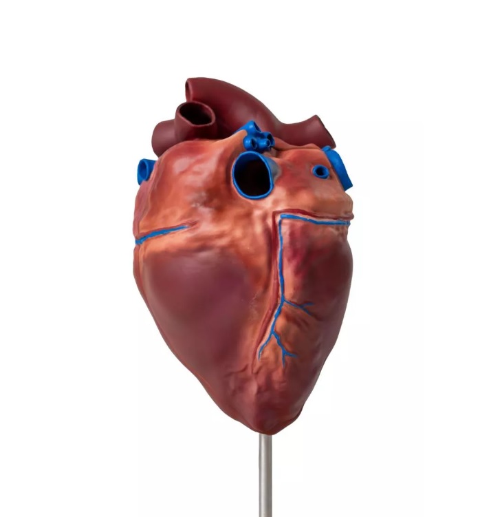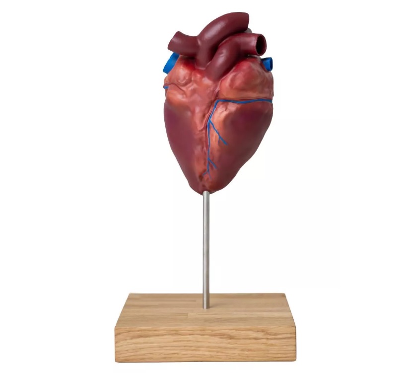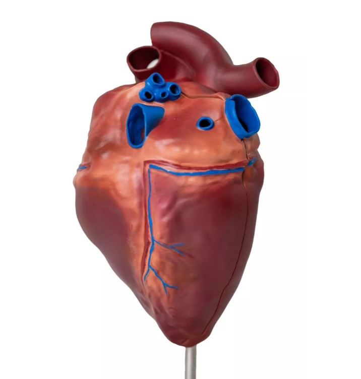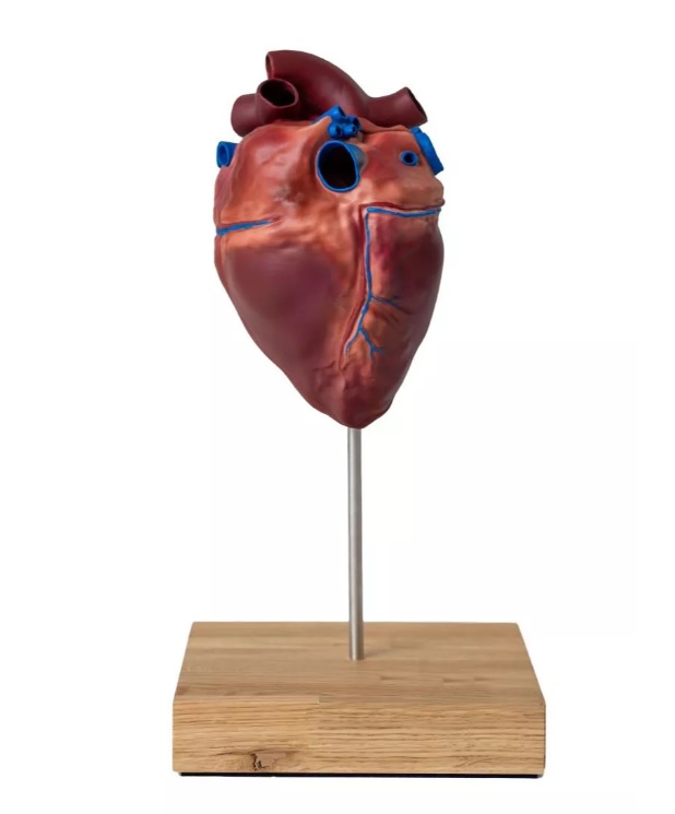 Zmenšený model zobrazuje anatomii koňského srdce včetně 2 síní, komor a ústí hlavních cév. Model je vyroben z tvrdého plastu a je na podstavci.