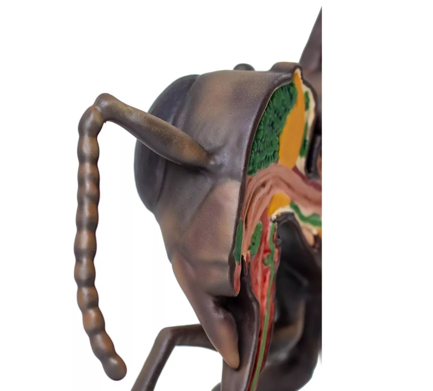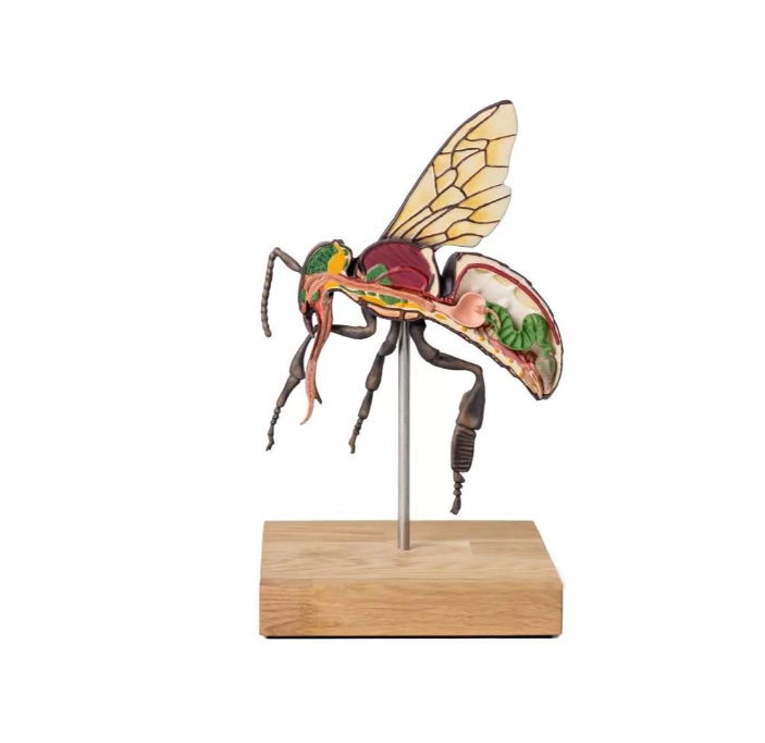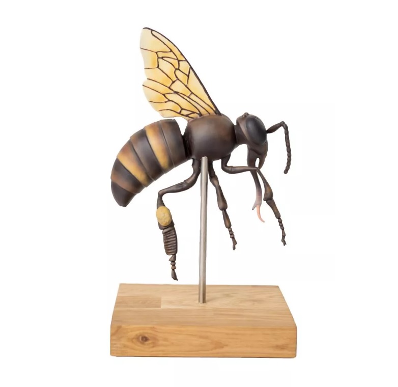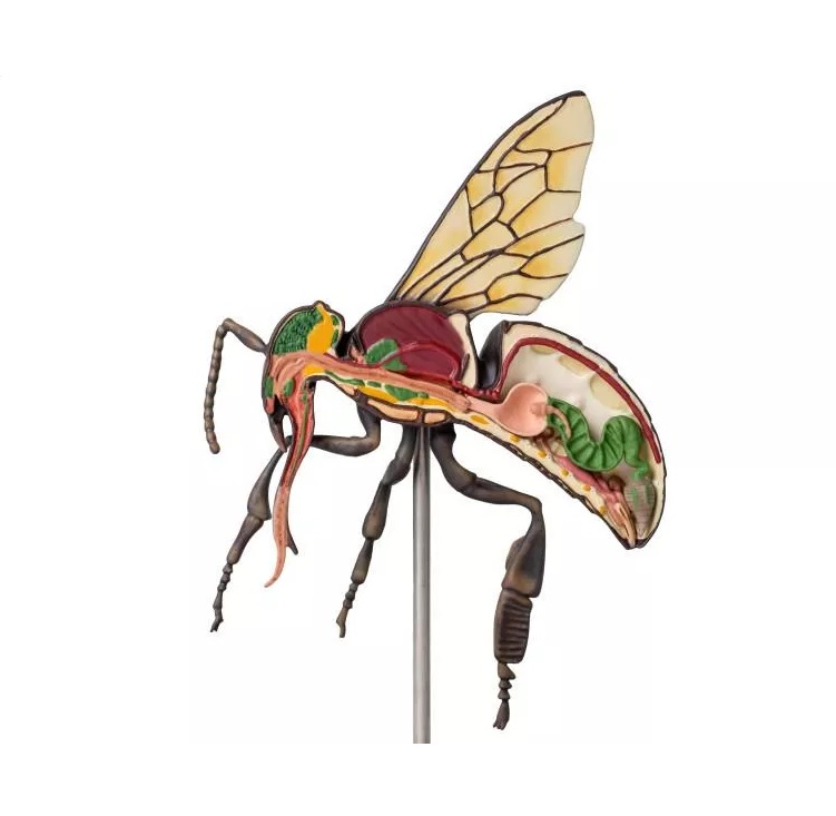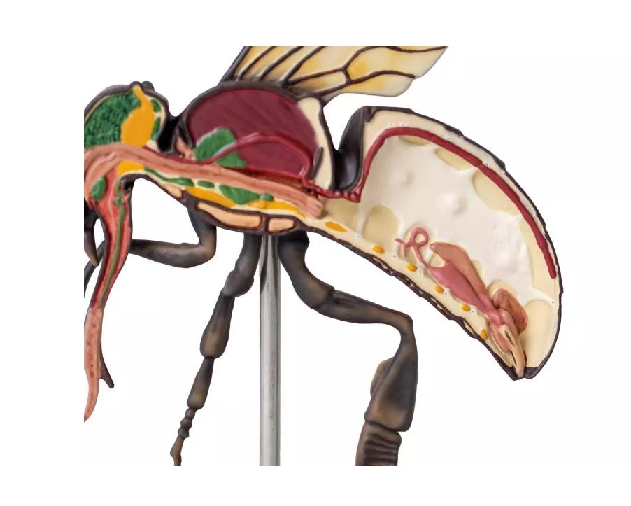 Detailní model včely 25 x zvětšený. Anatomický model poloviny těla včely zobrazuje vnitřní stavbu těla hmyzu. Jedna noha je u modelu odnímatelná, proto můžeme vidět pylový košíček s nashromážděným pylem na zadní straně nohy. Kromě toho je váček připojený ke kousku střeva. Je rovněž odnímatelný, aby bylo možné demonstrovat žihadlo a jed. Model je na podstavci a je rozložitelný na 3 části.
