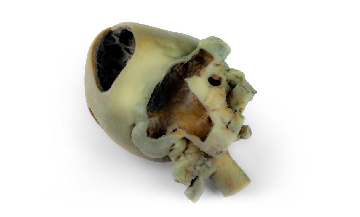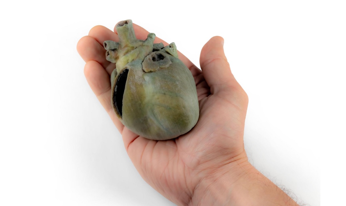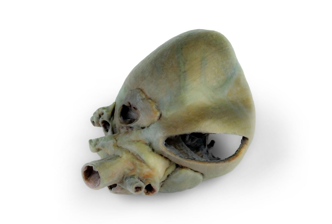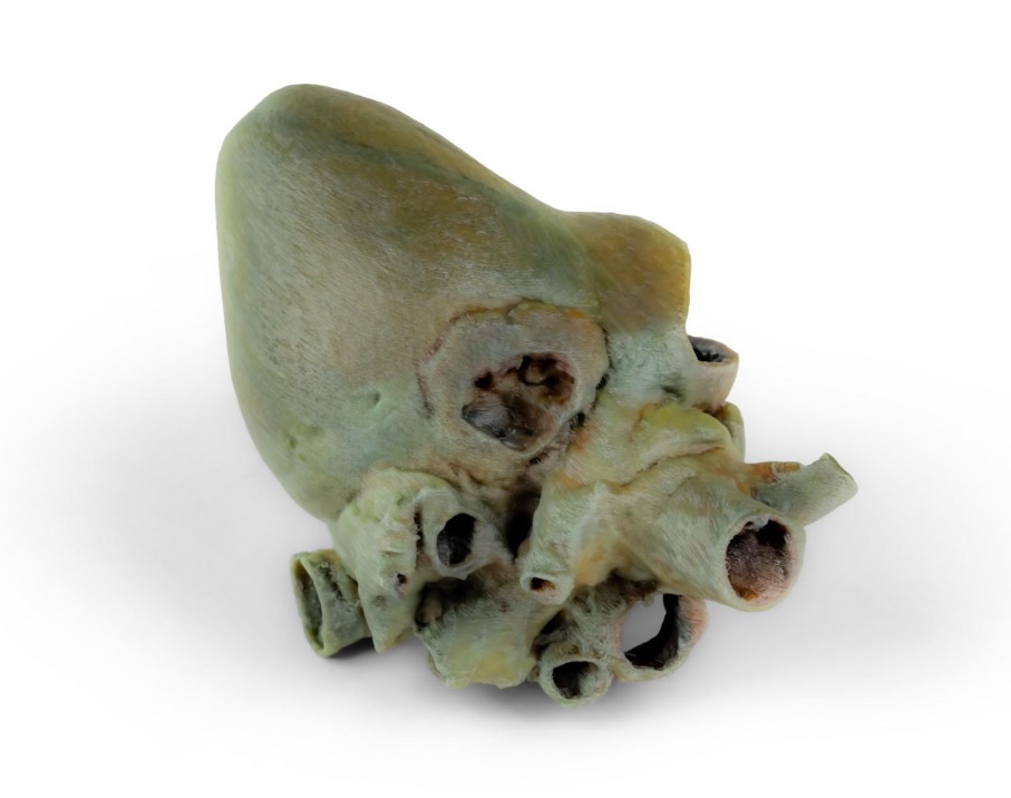 Tento model demonstruje anatomické rysy vnějšího povrchu srdce, včetně síňového a aurikulárního povrchu. Na srdeční bázi je jasně viditelná vzestupná aorta a její vztah k plicnímu kmeni a kaudální (dolní) dutá žila vedoucí do pravé síně. Je patrné větvení plicního kmene do plicních tepen, stejně jako ústí plicních žil do levé síně. Viditelná je jak interventrikulární, tak koronární rýha.