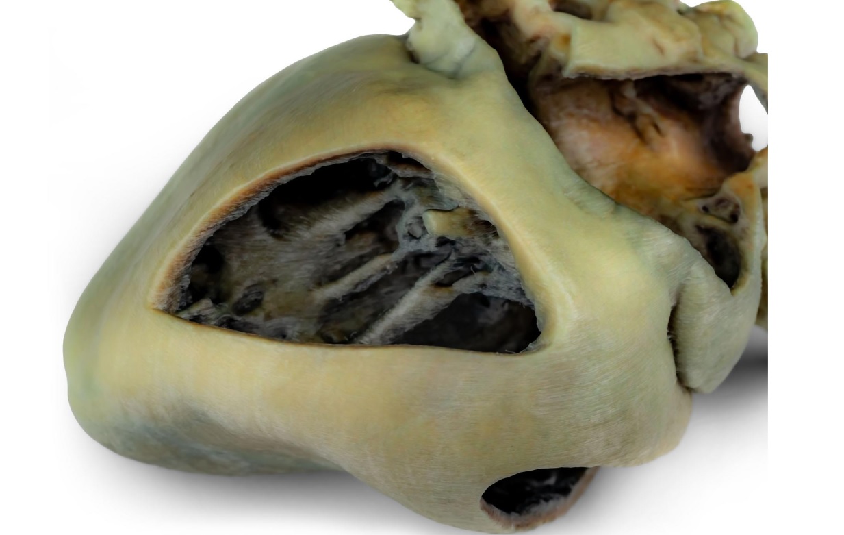 Část stěny pravé síně byla odstraněna, aby se odhalila pravá atrioventrikulární (trikuspidální-trojcípá) chlopeň, včetně chordae tendineae (šlašinky) a papilárních svalů. Dále je viditelná septomarginální trabekula (svalové vlákno) v pravé komoře a její průběh z komory do plicního kmene. Stěna levé síně je také otevřena, aby se ukázal její vnitřní prostor.