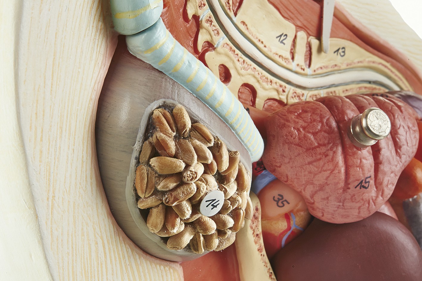 Skutečná velikost produktu SOMSO-Plast®. Je modelován z přirozené kostry. Na pravé straně je zobrazeno peří, na levé straně jsou orgány. Jednoduchou operací může být trup z peří vyndán, aby byl odkryt svalový systém. Vnitřní orgány jsou vyjímatelné: levá plíce, část jater, žaludek.