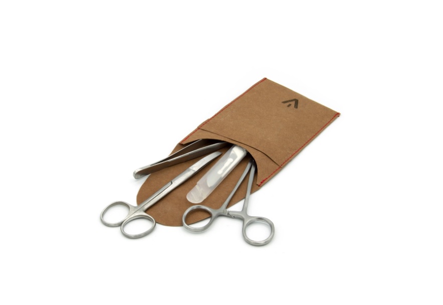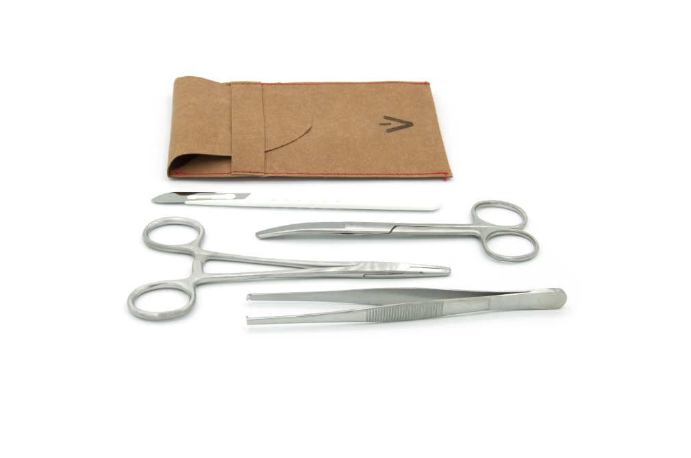 Sada šicích nástrojů obsahuje: skalpel, pinzetu, držák jehly a chirurgické nůžky. Nástroje jsou uloženy v praktickém pouzdře z veganské koženky.