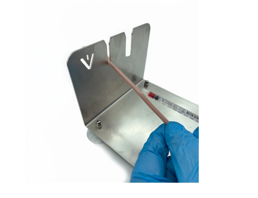Samostatný robustní držák z nerezové oceli umožňuje bezpečné uchycení našeho modelu (ocas myši) a zajišťuje praktickou a stabilní fixaci během nácviku intravenózních injekcí a odběrů krve.